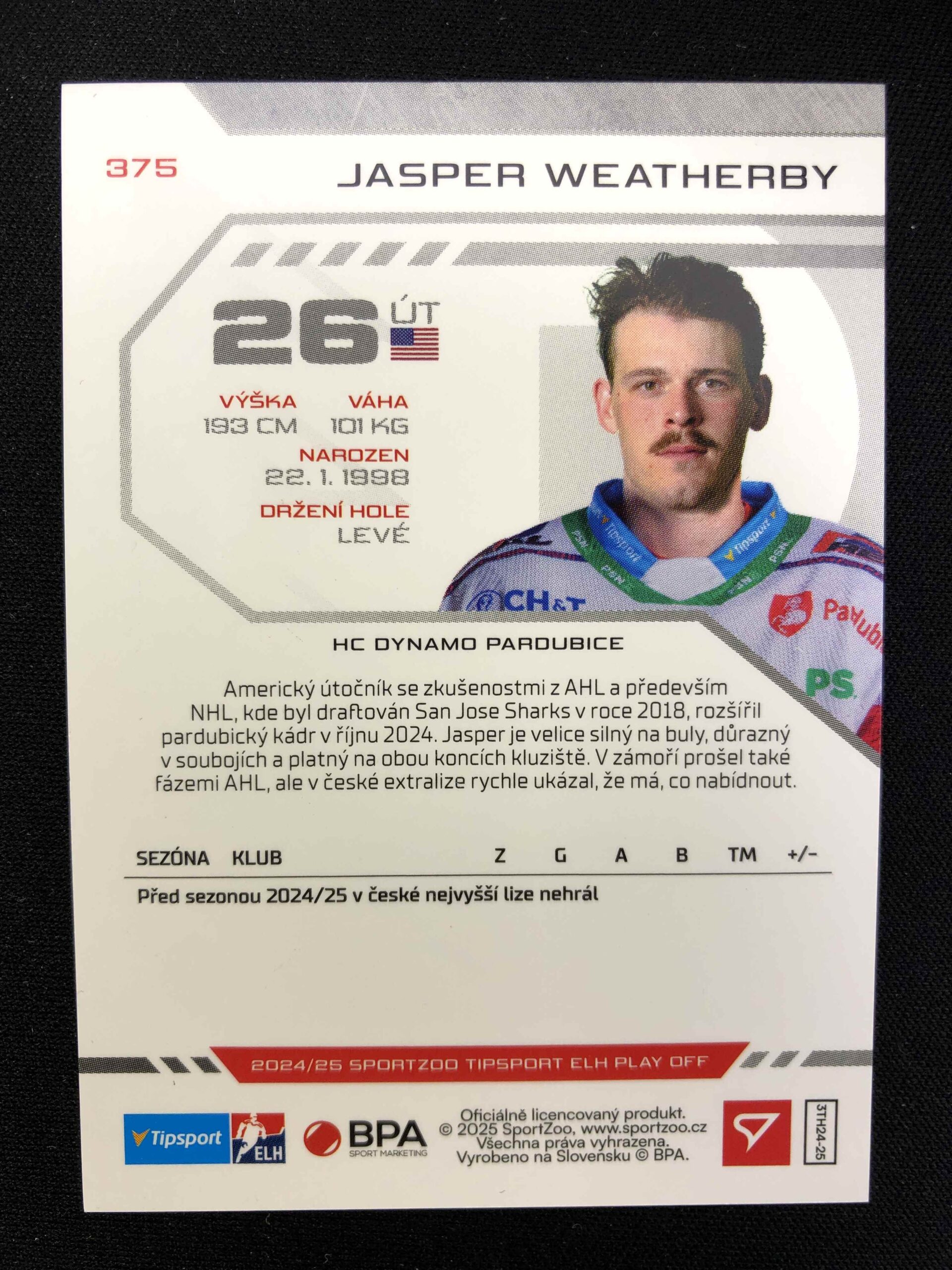 Sběratelská karta 2024/2025 Sportzoo Play Off Puck Marks 375 Jasper Weatherby Paralel