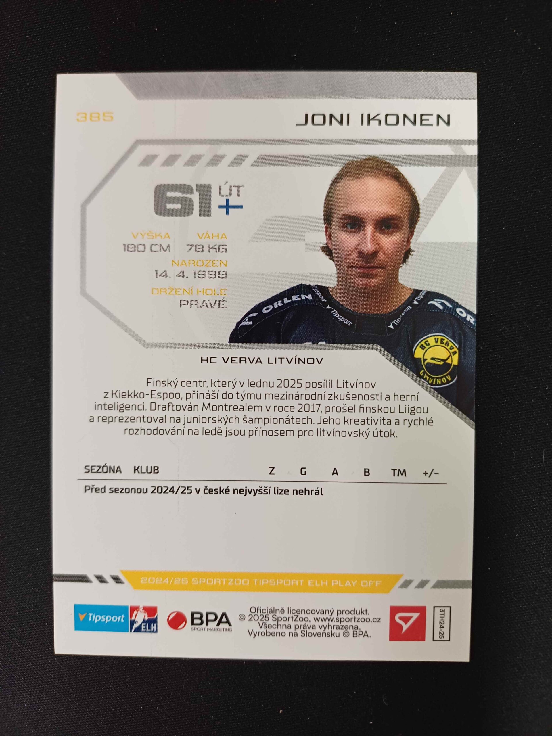 Sběratelská karta 2024/2025 Sportzoo Play Off Puck Marks 385 Joni Ikonen Paralel