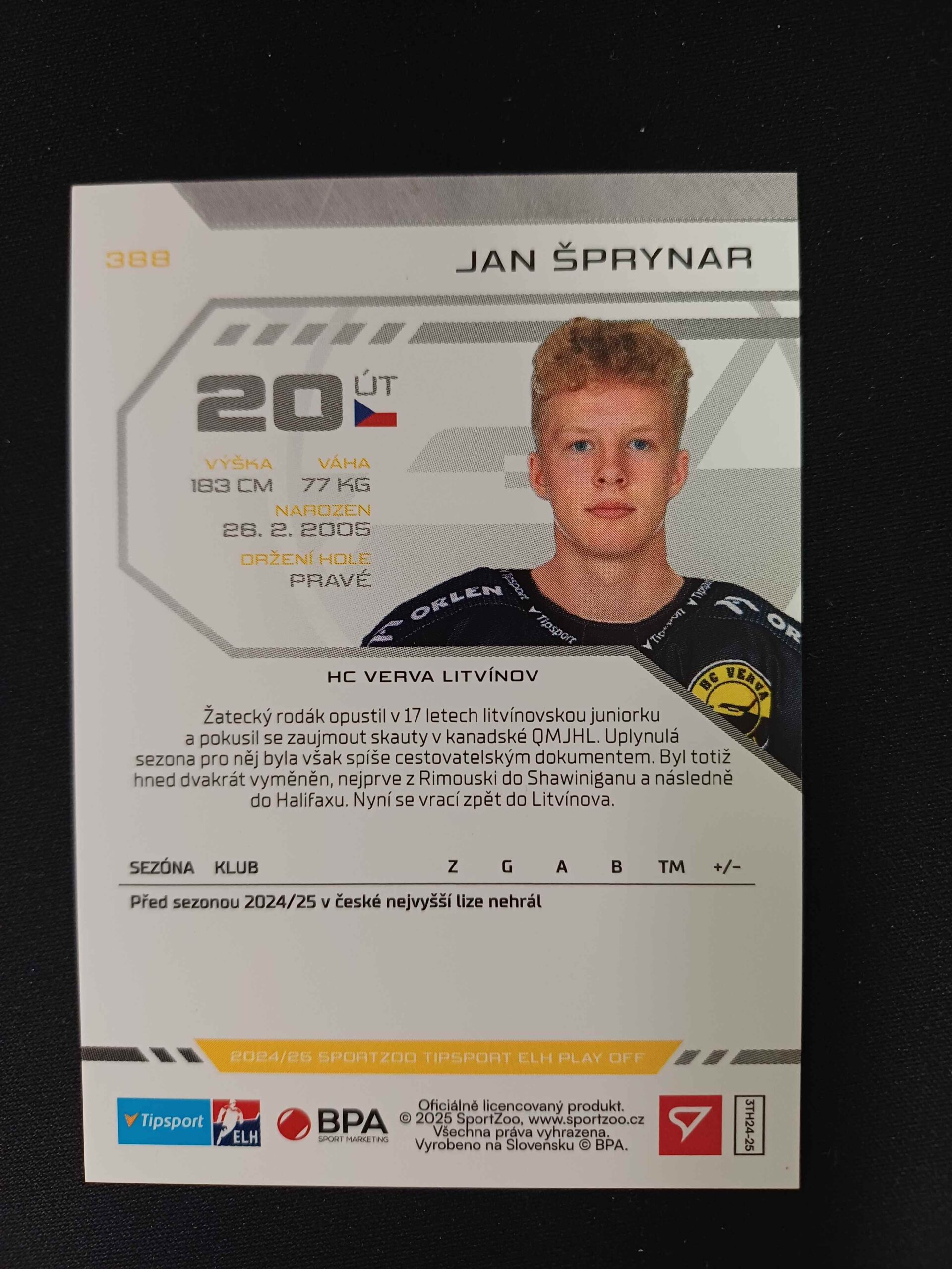 Sběratelská karta 2024/2025 Sportzoo Play Off Puck Marks 388 Jan Šprynar Paralel