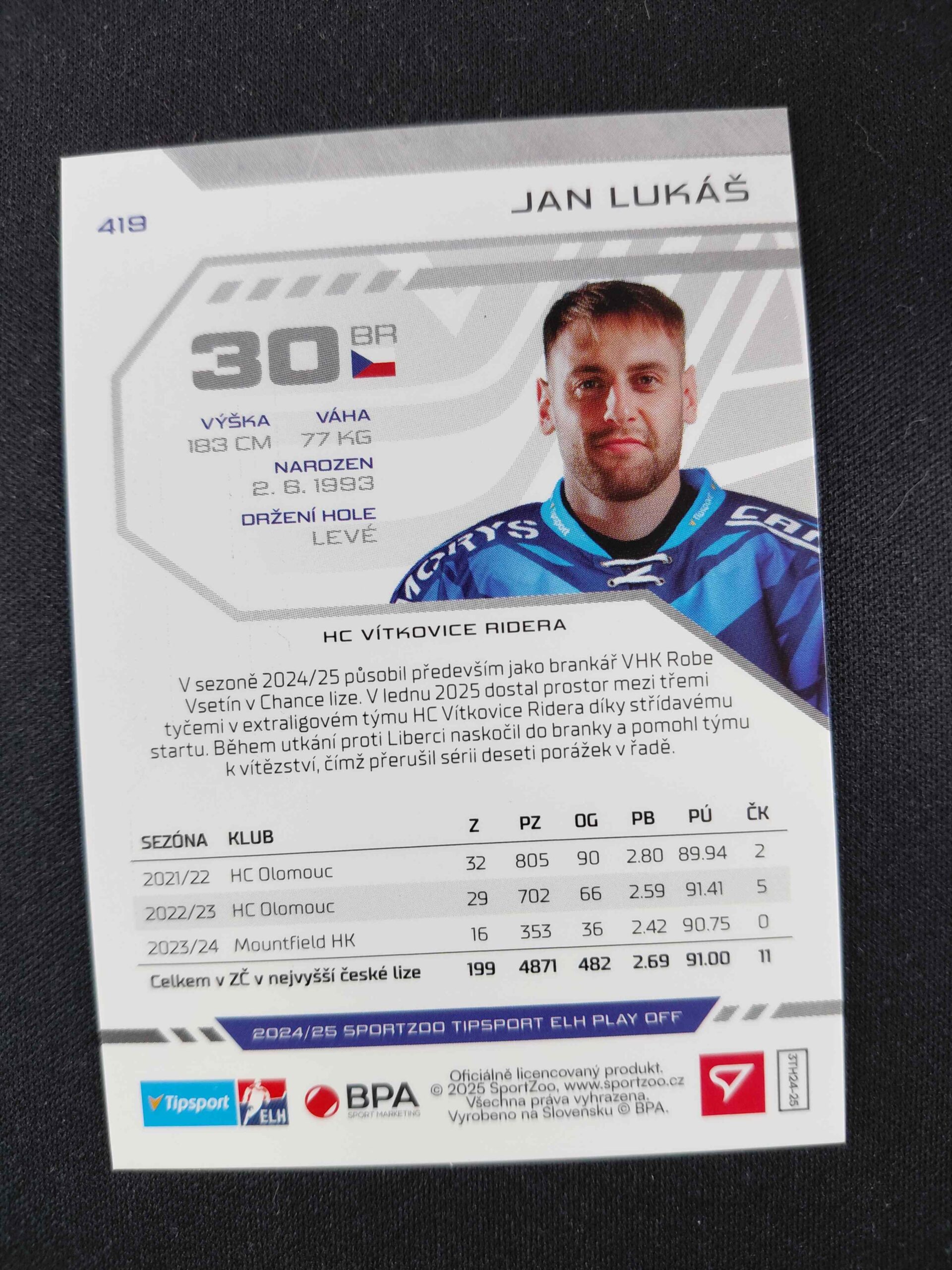 Sběratelská karta 2024/2025 Sportzoo Play Off Puck Marks 419 Jan Lukaš Paralel