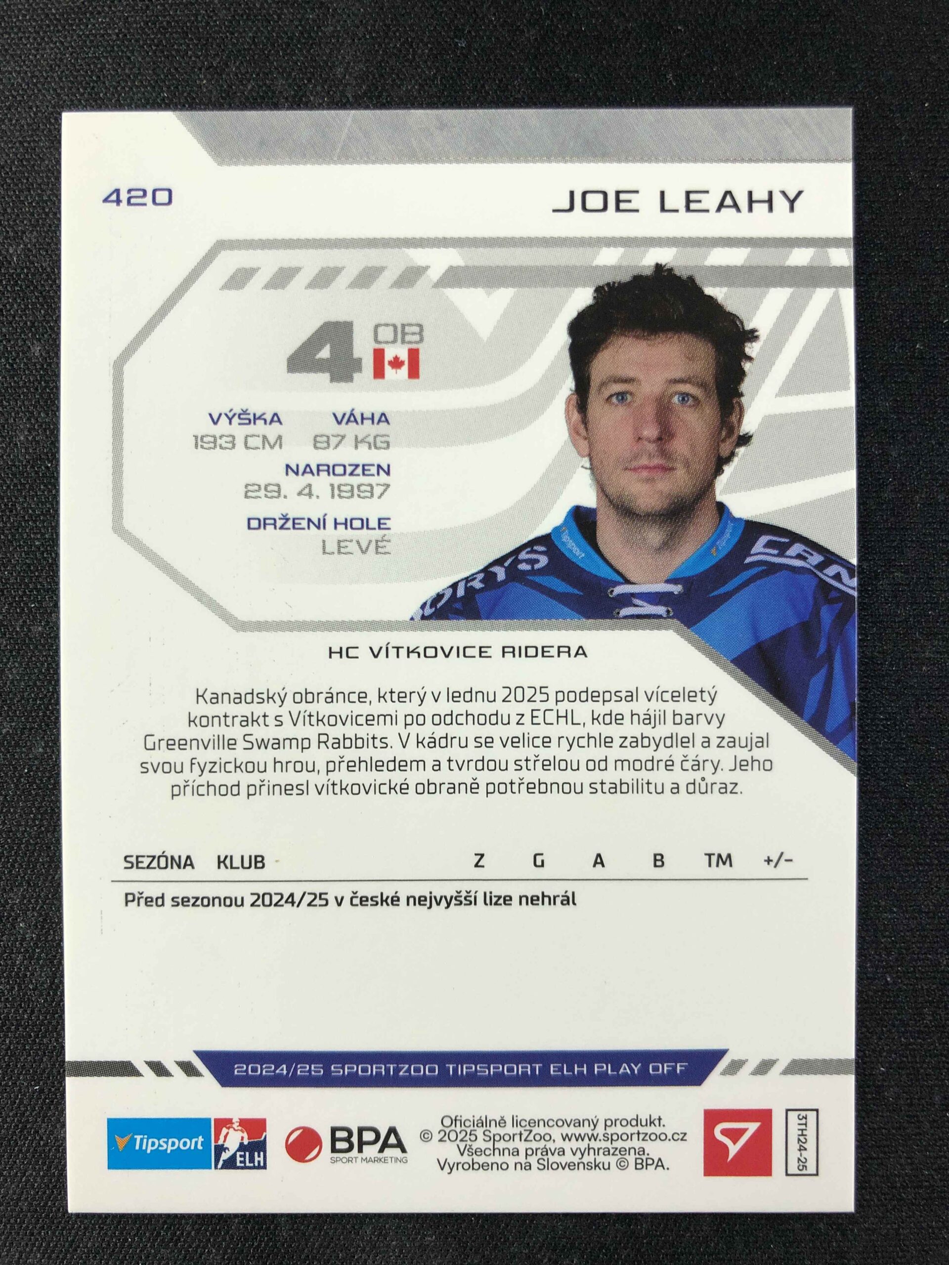 Sběratelská karta 2024/2025 Sportzoo Play Off Puck Marks 420 Joe Leahy Paralel
