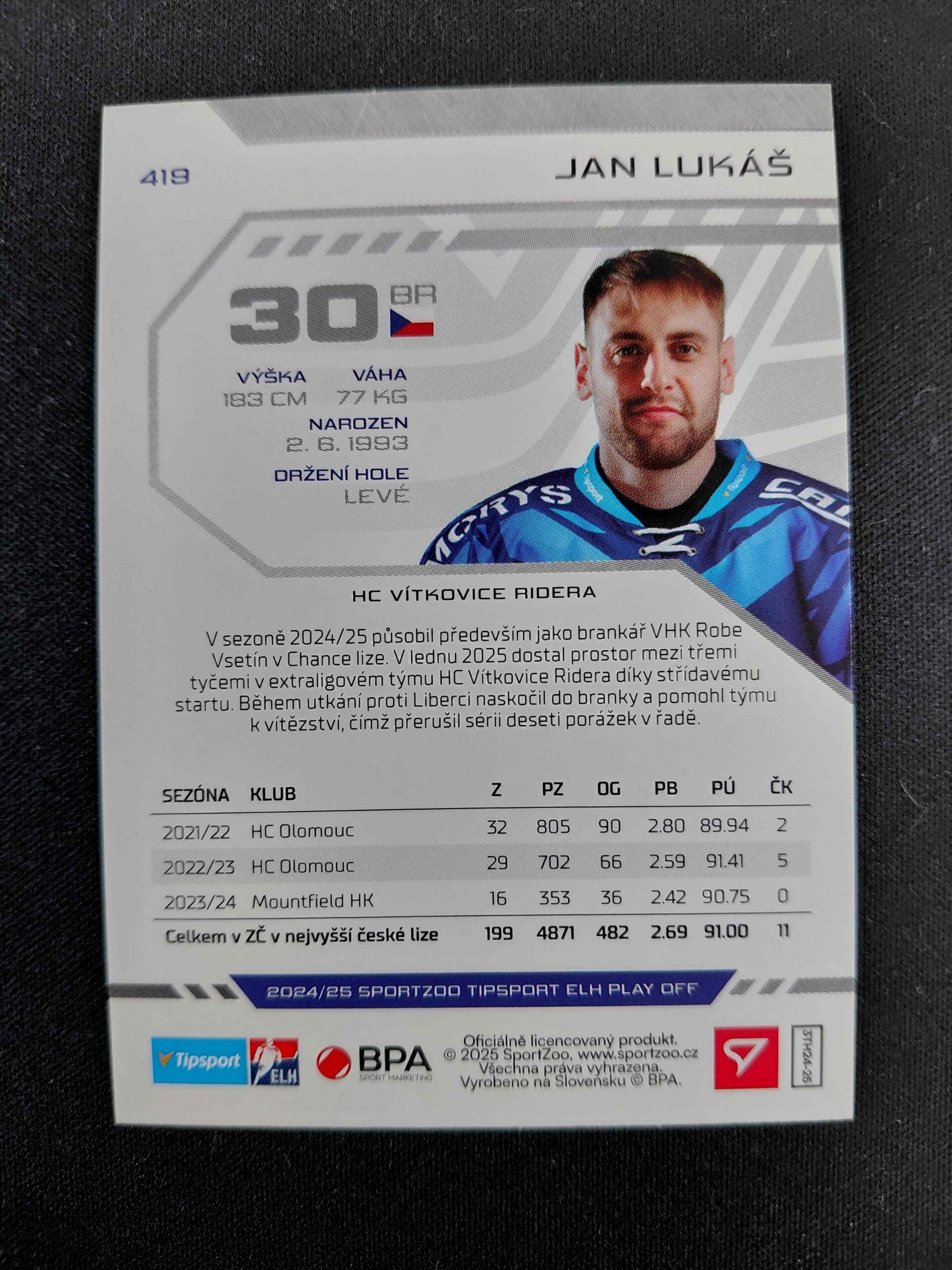 Sběratelská karta 2024/2025 Sportzoo Play Off Purple Iceberg 419 Jan Lukaš Paralel 15/60