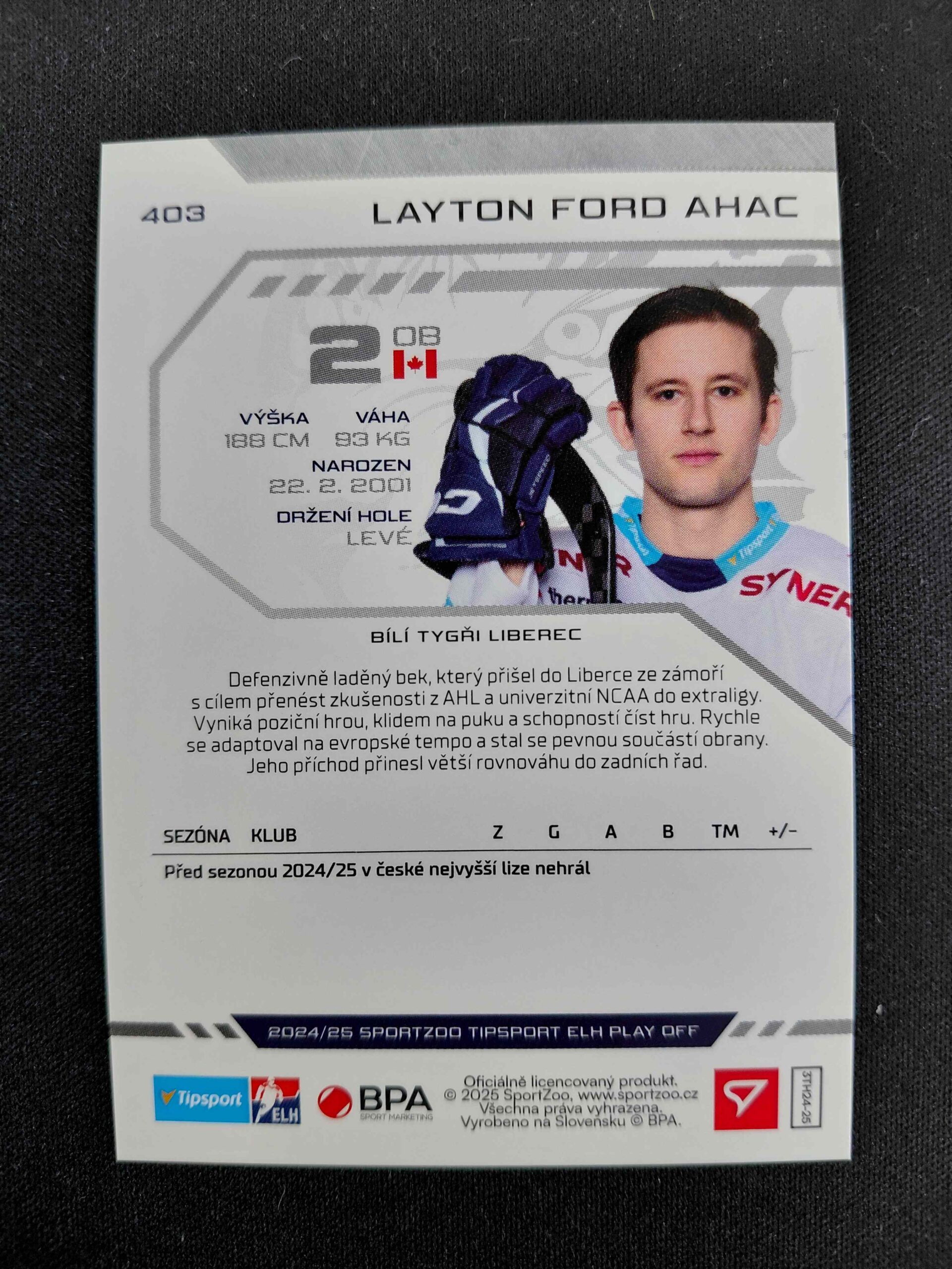Sběratelská karta 2024/2025 Sportzoo Play Off Red Sparks 403 Layton Ford Ahac Paralel