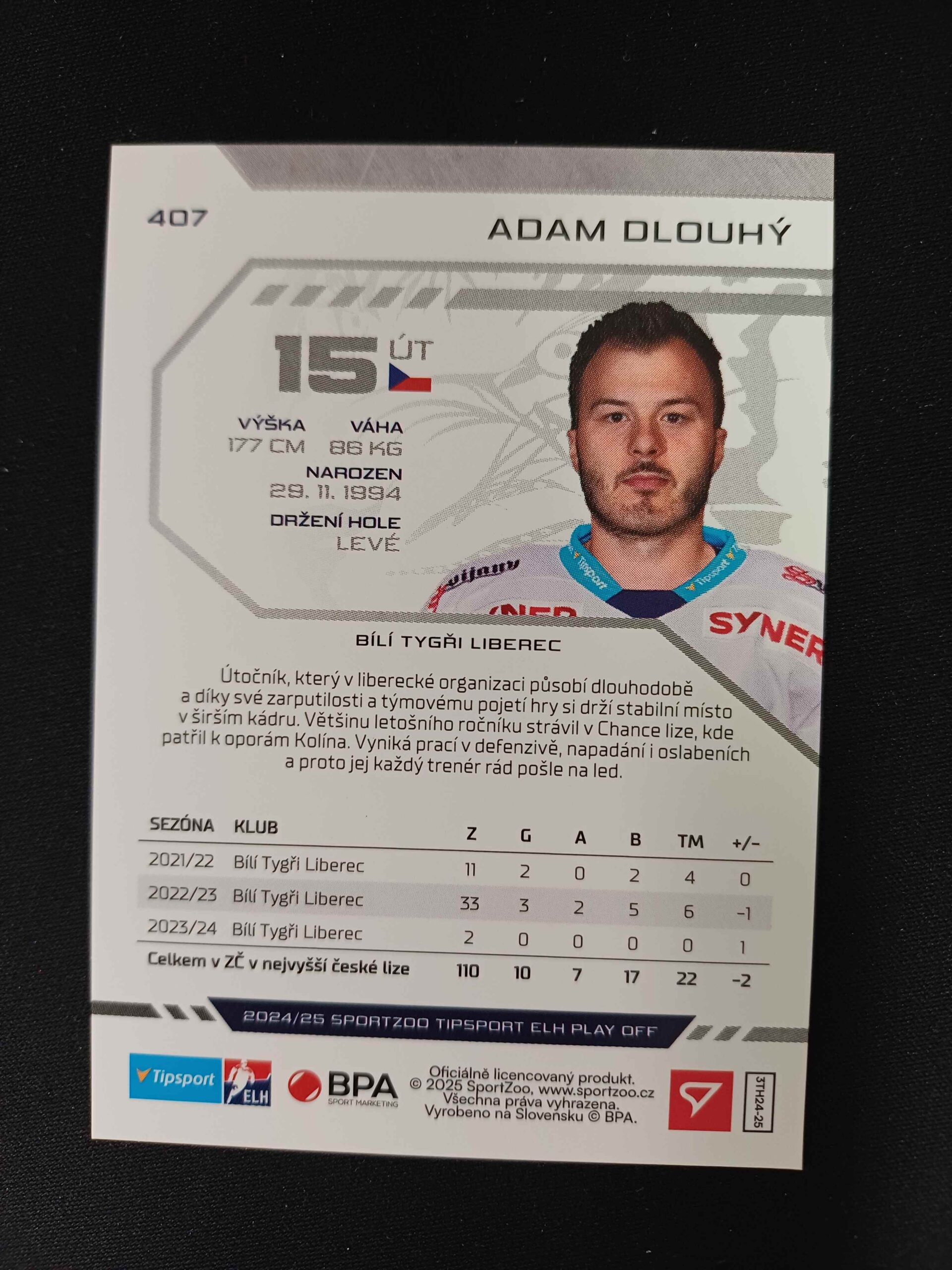 Sběratelská karta 2024/2025 Sportzoo Play Off Red Sparks 407 Adam Dlouhý Paralel