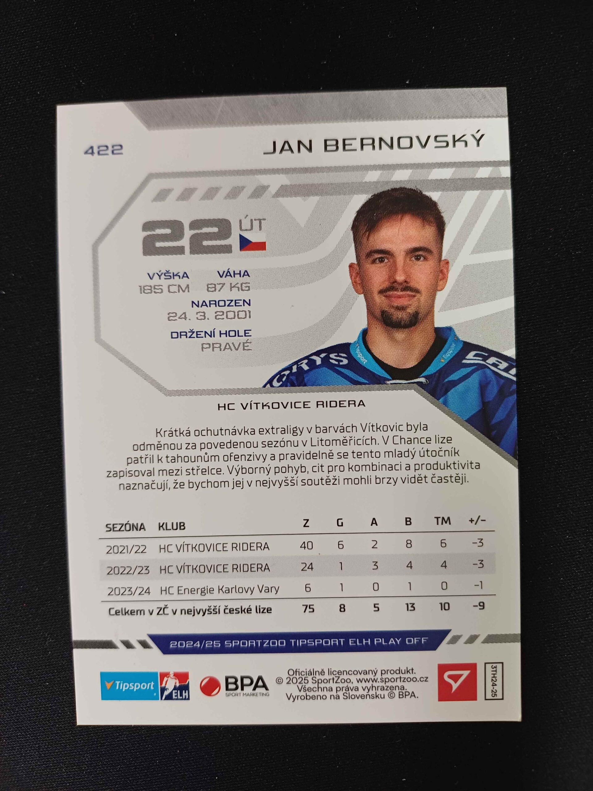 Sběratelská karta 2024/2025 Sportzoo Play Off Red Sparks 422 Jan Bernovský Paralel