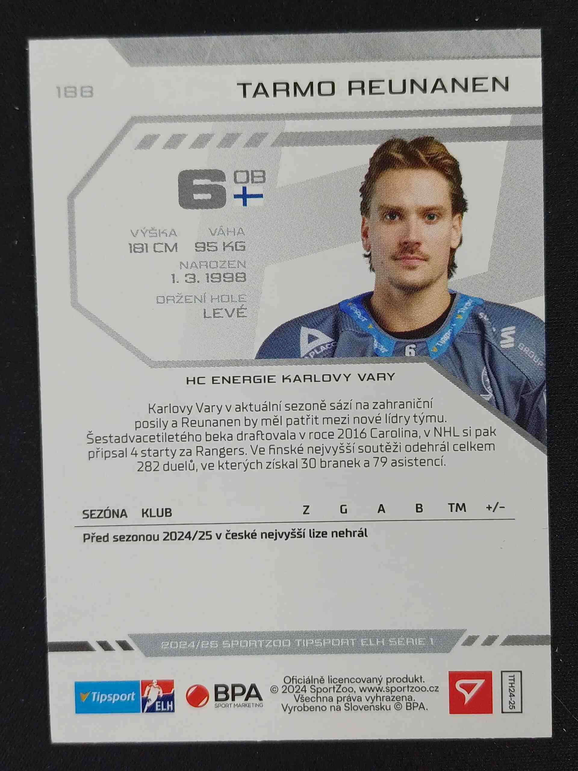 Sběratelská karta 2024/2025 Sportzoo Serie 1 Green Glitter 188 Tarmo Reunanen Paralel 08/30