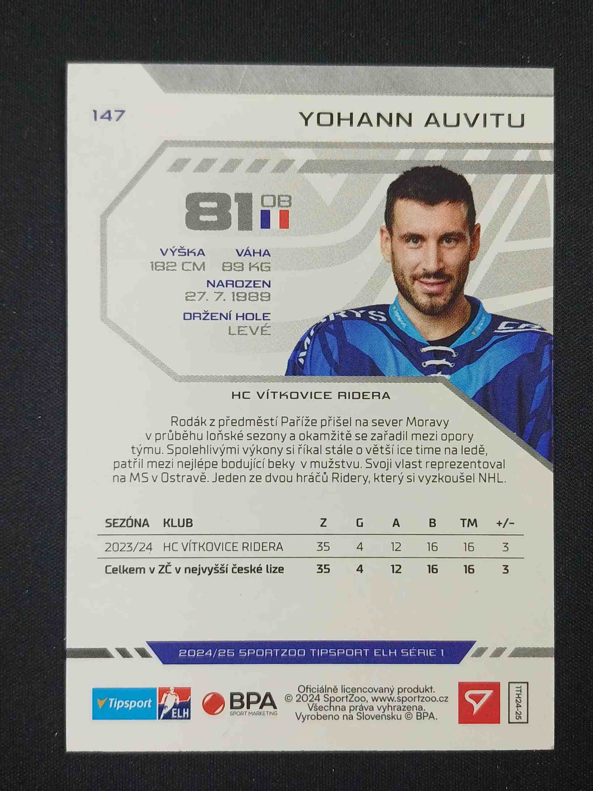 Sběratelská karta 2024/2025 Sportzoo Serie 1 Puck Marks 147 Yohann Auvitu Paralel