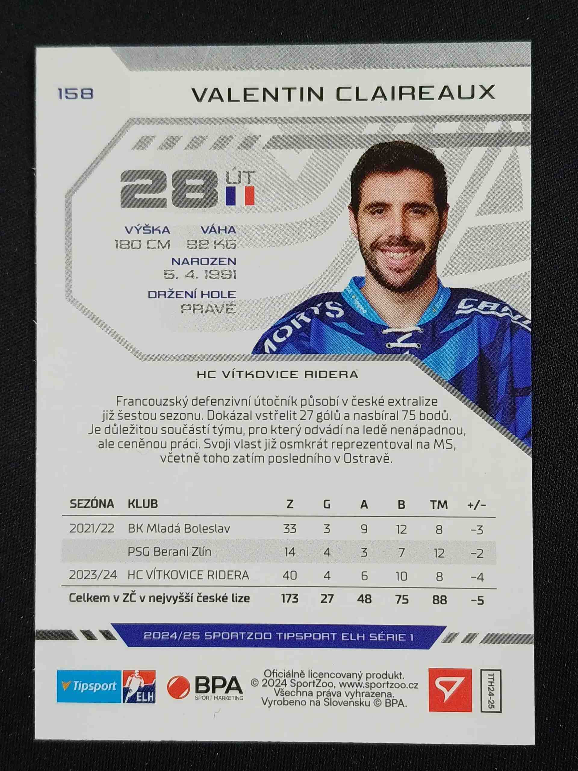Sběratelská karta 2024/2025 Sportzoo Serie 1 Puck Marks 158 Valentin Claireaux Paralel
