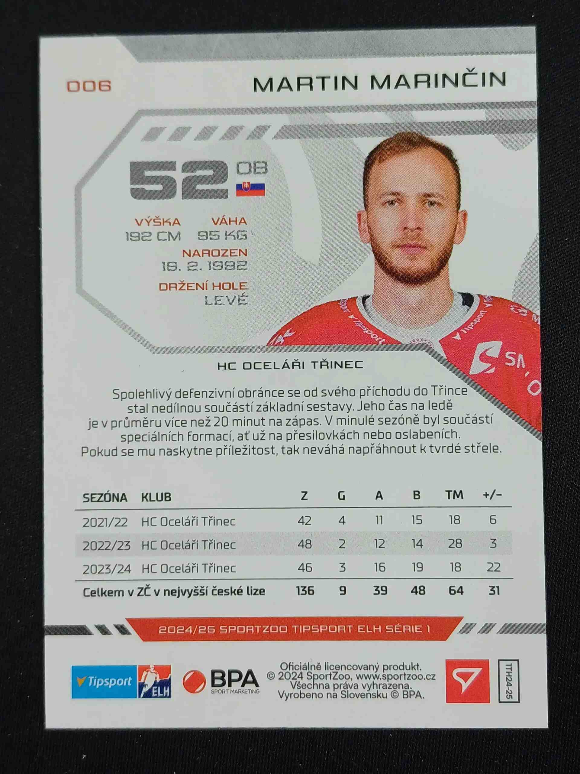 Sběratelská karta 2024/2025 Sportzoo Serie 1 Red Sparks 6 Martin Marinčin Paralel