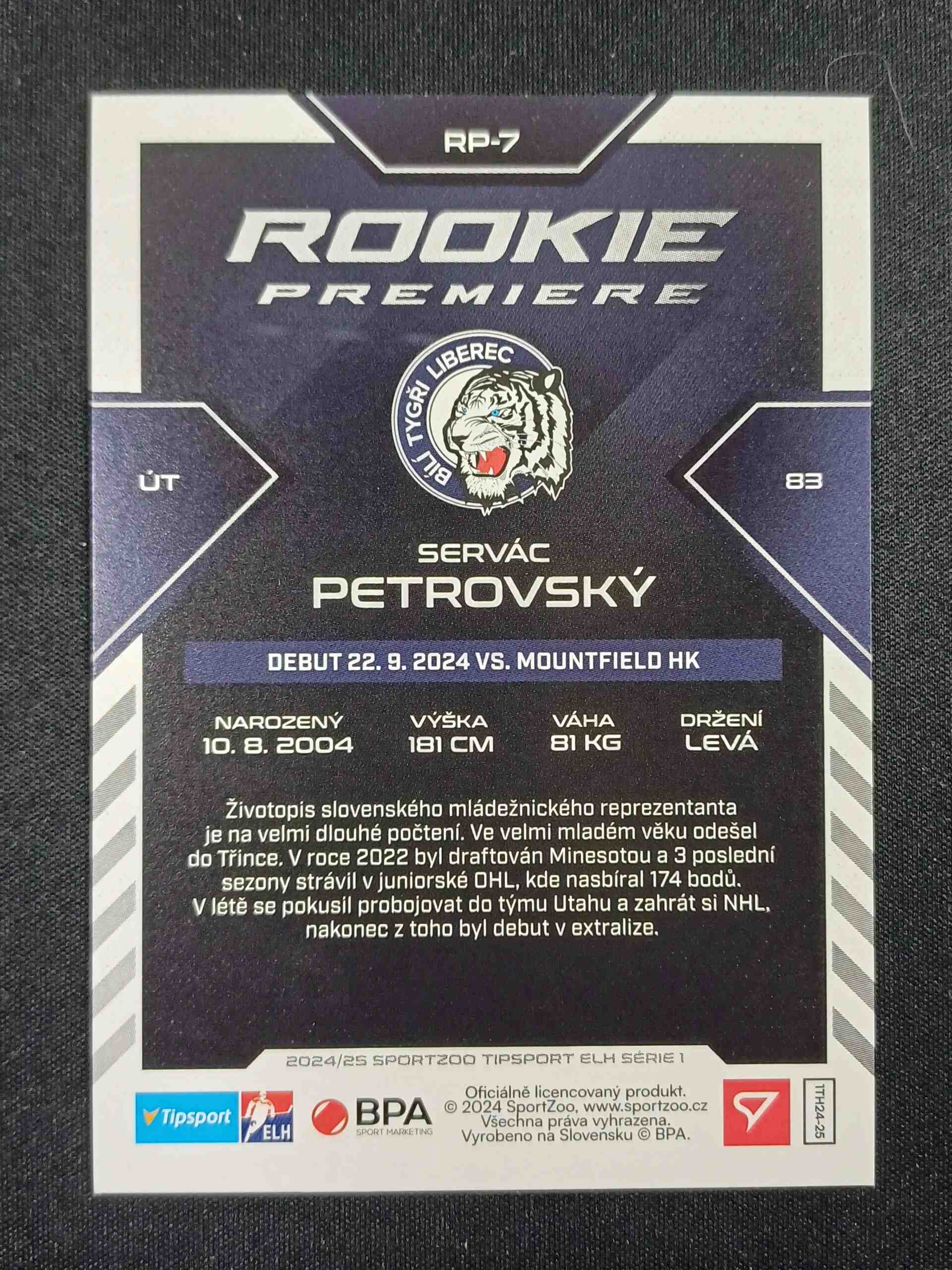 Sběratelská karta 2024/2025 Sportzoo Serie 1 Rookie Premiere RP-7 Servác Petrovský Inzert