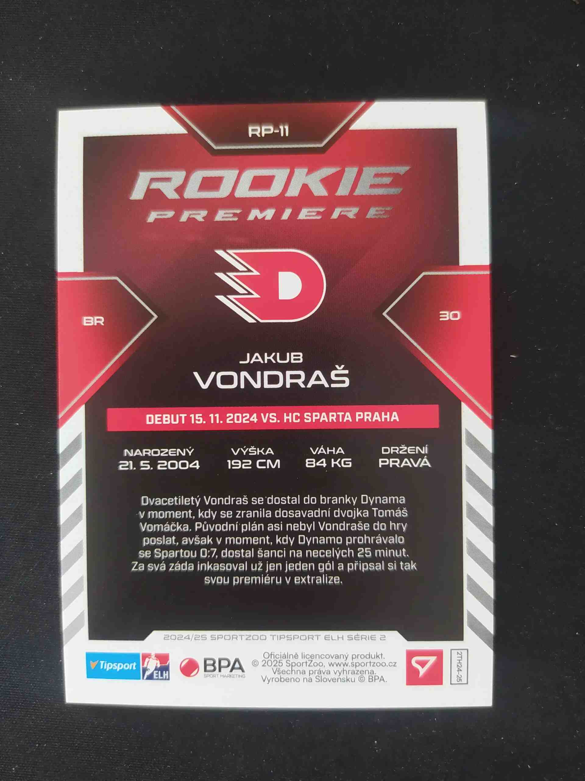 Sběratelská karta 2024/2025 Sportzoo Serie 2 Rookie Premiere Limited RP-11 Jakub Vondraš Inzert 96/99