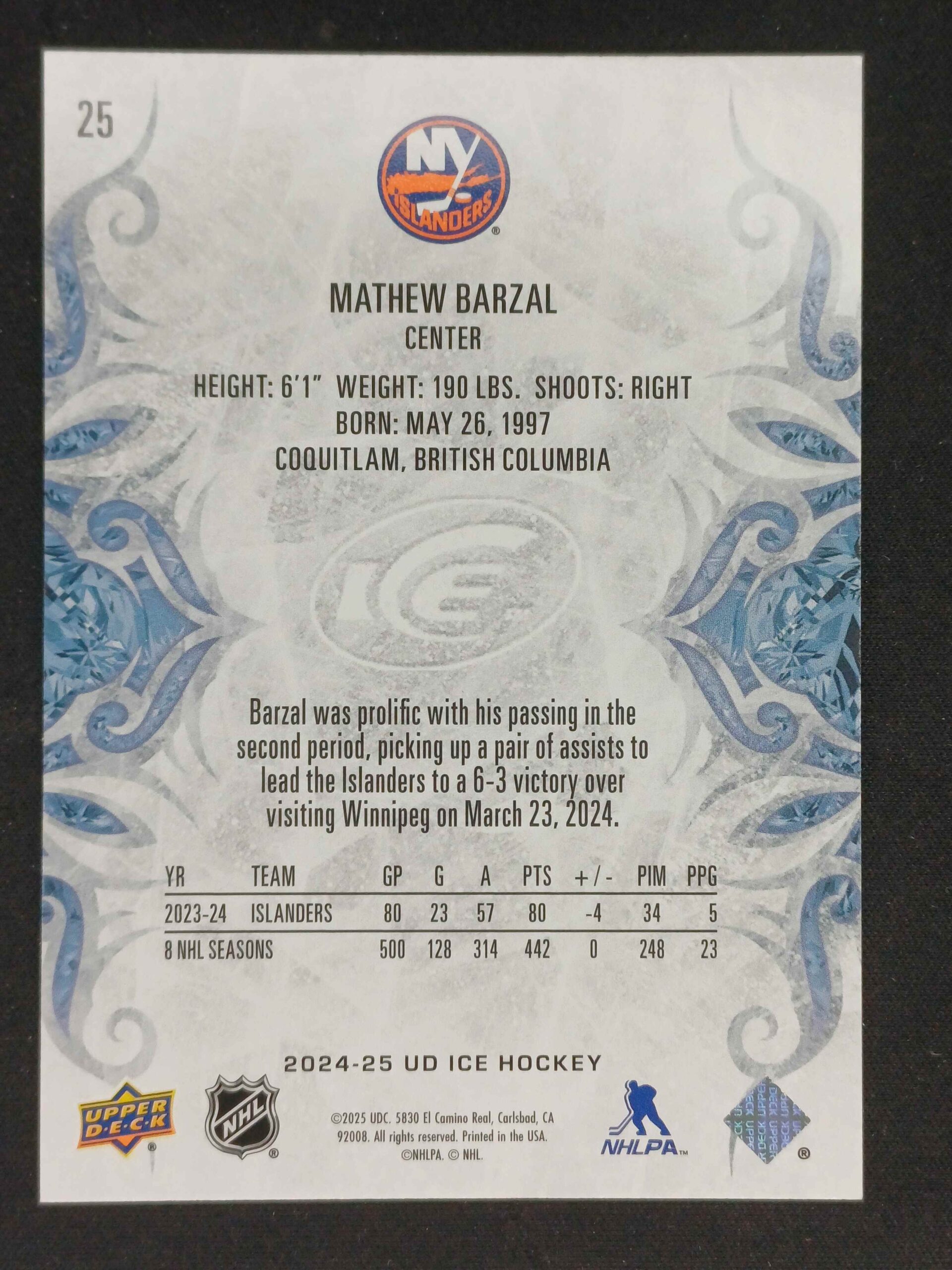 Sběratelská karta 2024/2025 Upper Deck ICE Base 25 Mathew Barzal