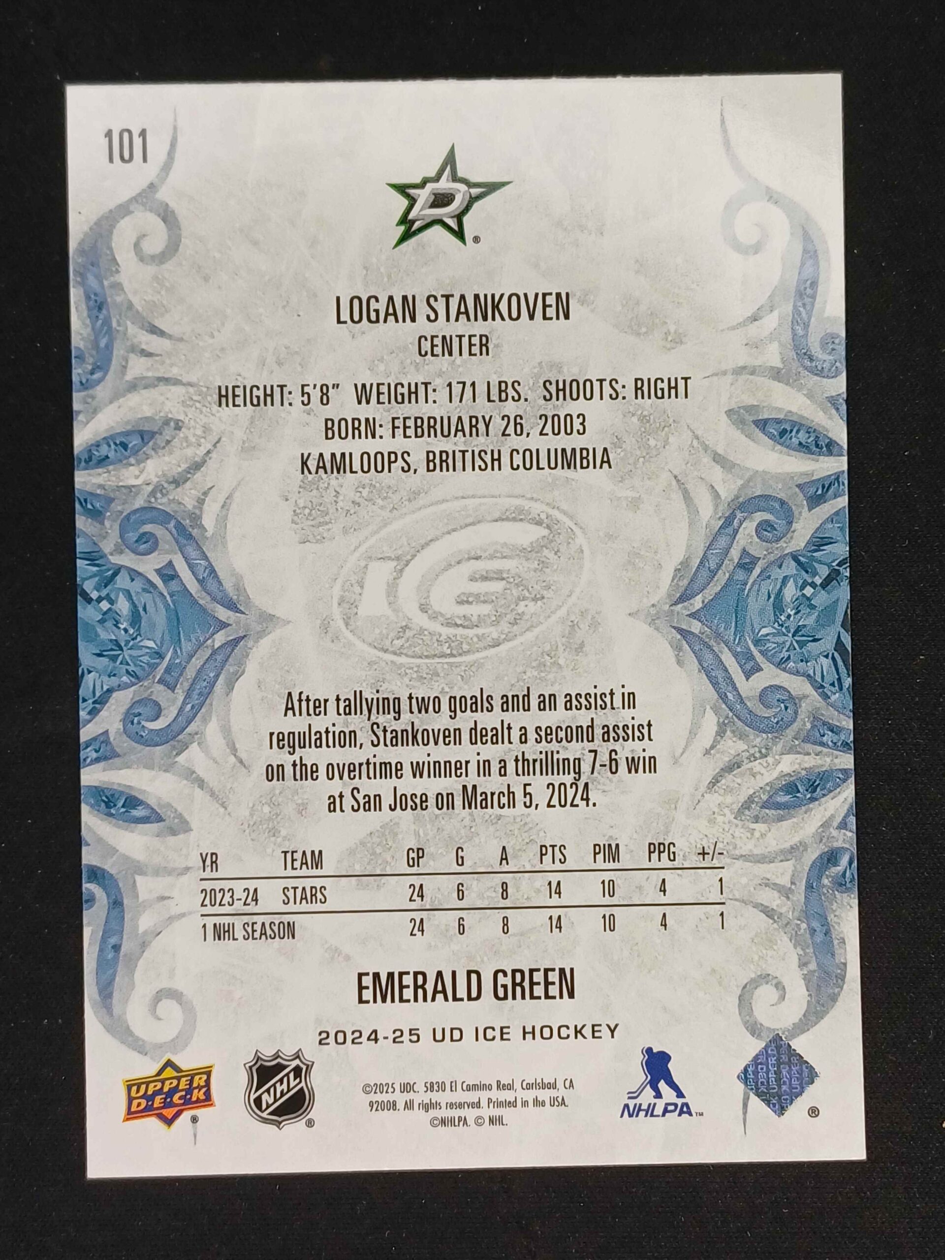 Sběratelská karta 2024/2025 Upper Deck ICE Emerald Green 101 Logan Stankoven Paralel