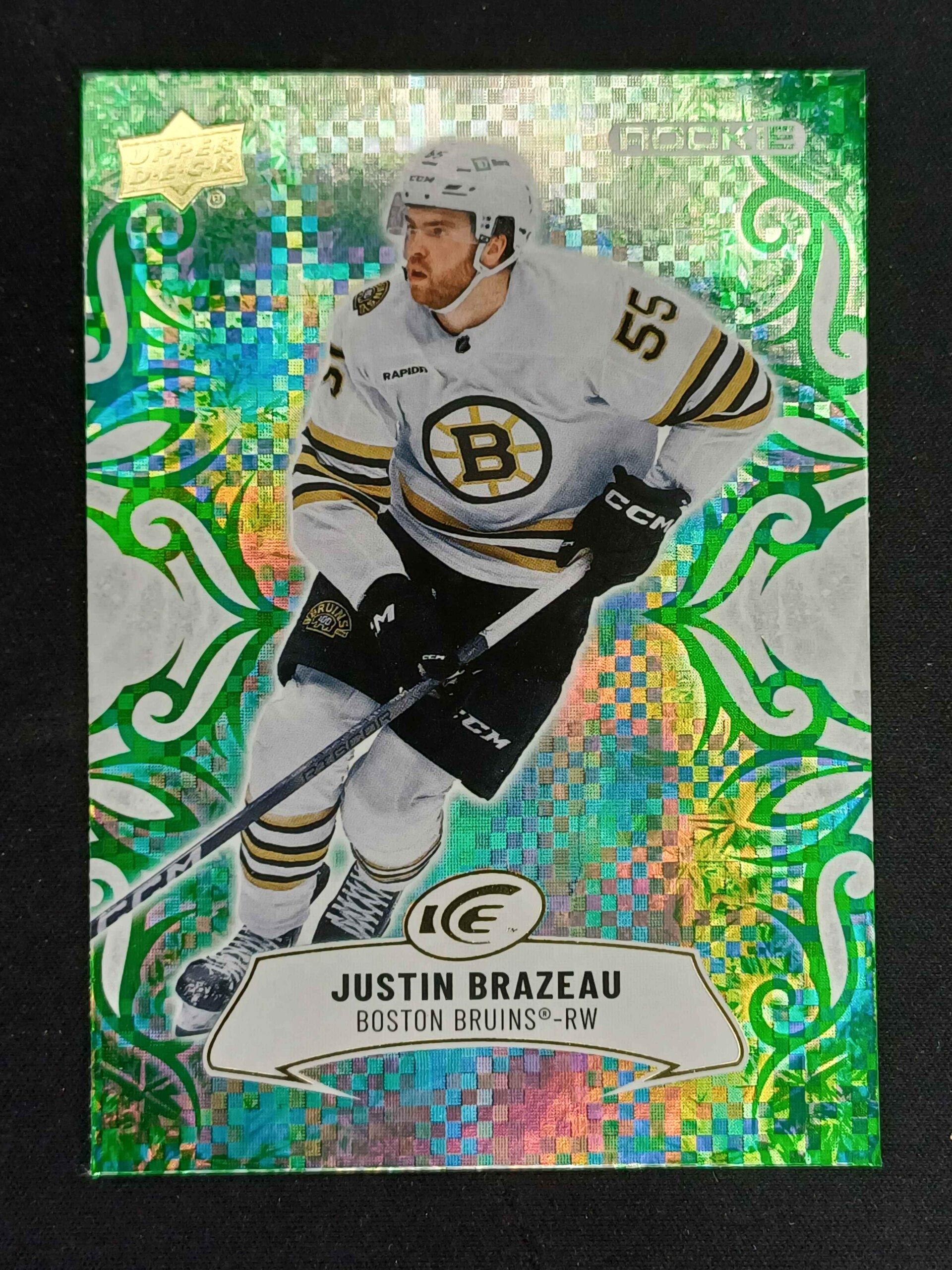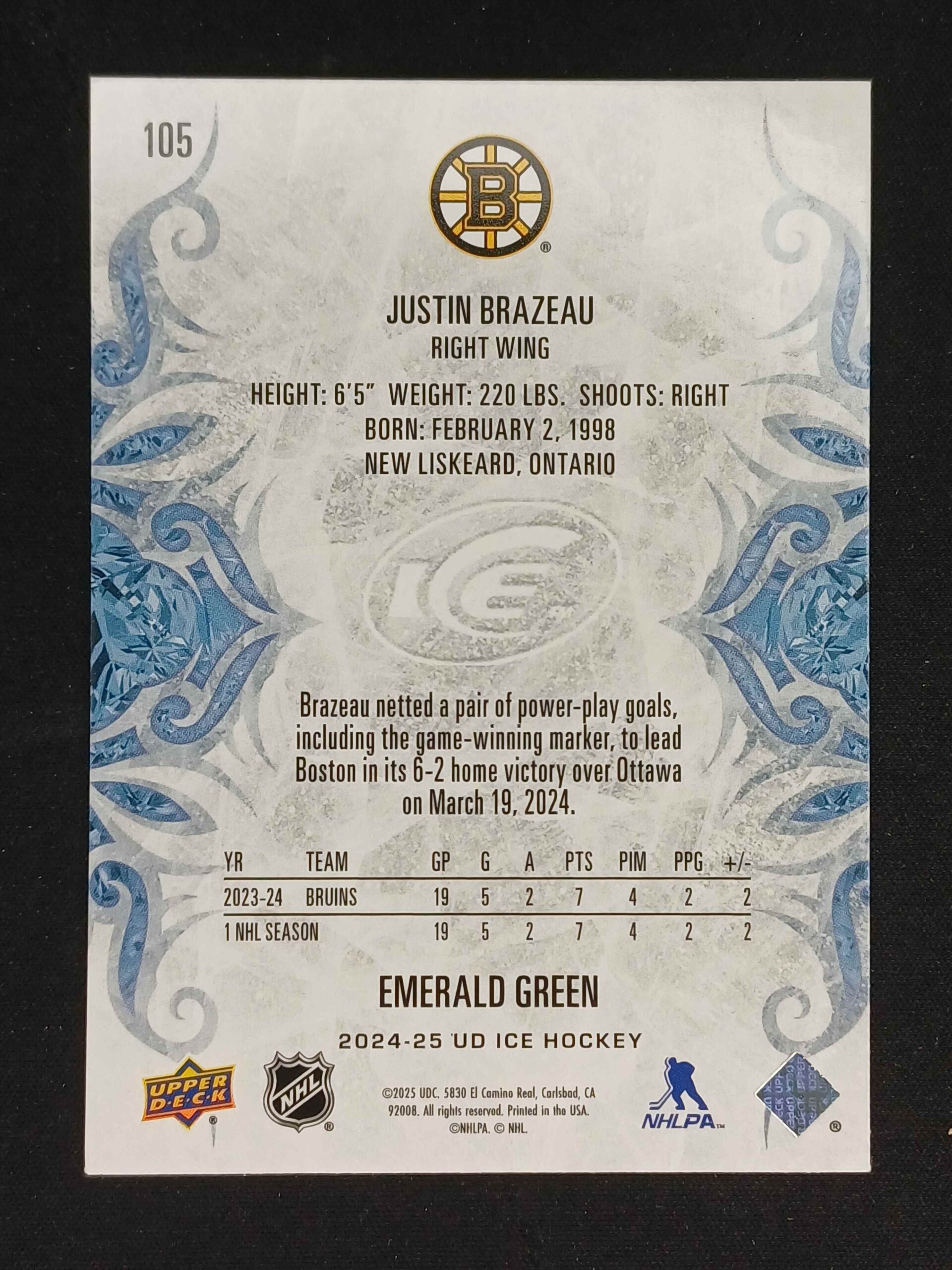 Sběratelská karta 2024/2025 Upper Deck ICE Emerald Green 105 Justin Brazeau Paralel