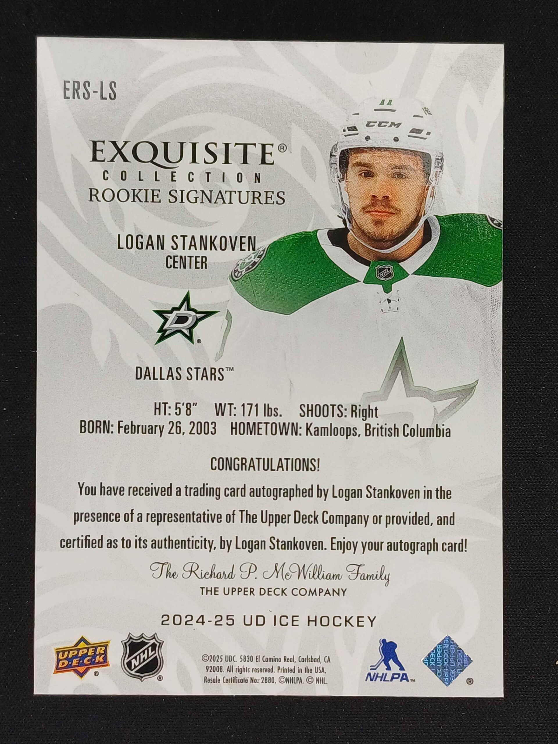 Sběratelská karta 2024/2025 Upper Deck ICE Exquisite Collection Rookies Signatures ERS-LS Logan Stankoven AUTO 76/99