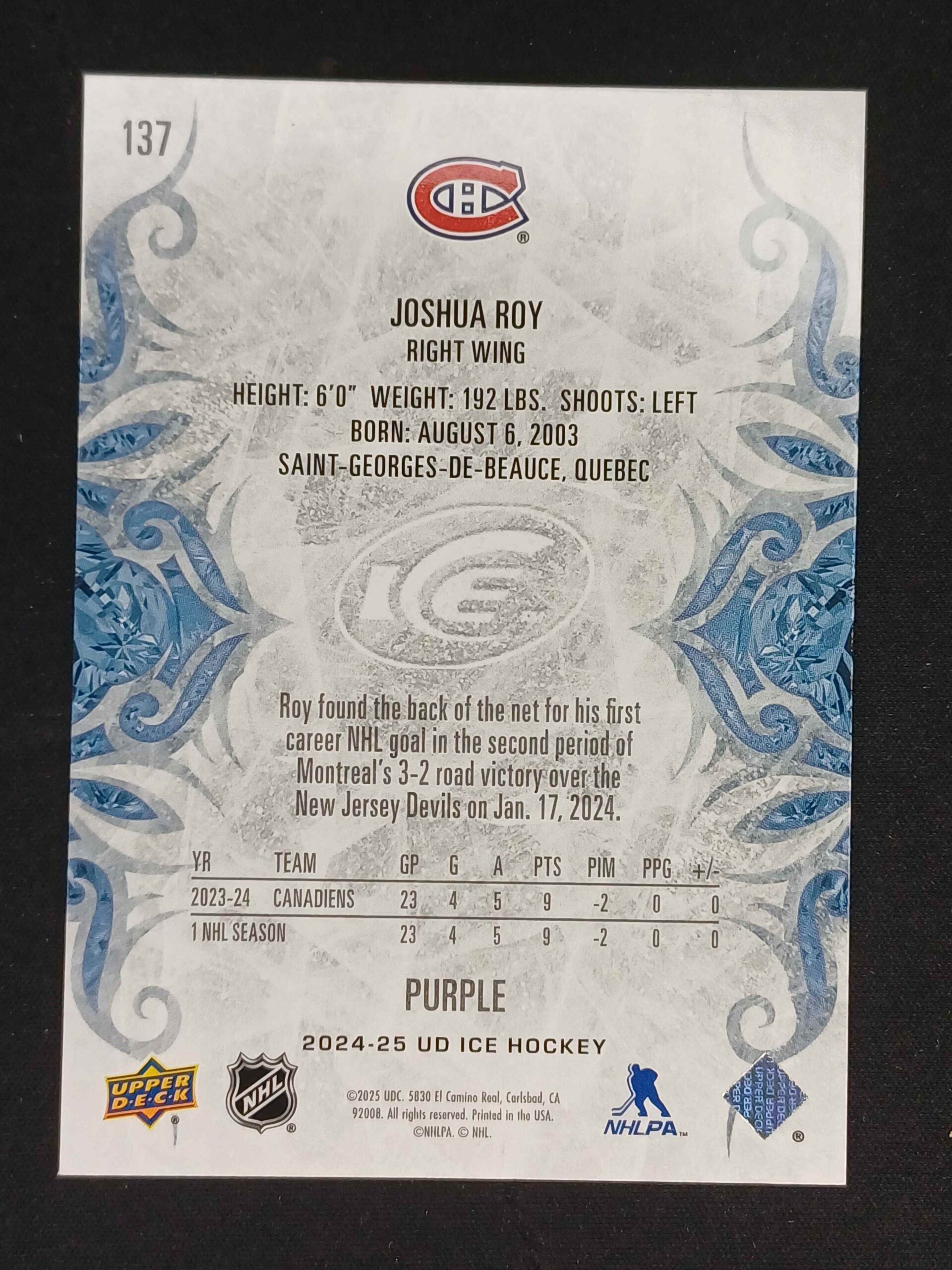 Sběratelská karta 2024/2025 Upper Deck ICE Purple 137 Joshua Roy Paralel