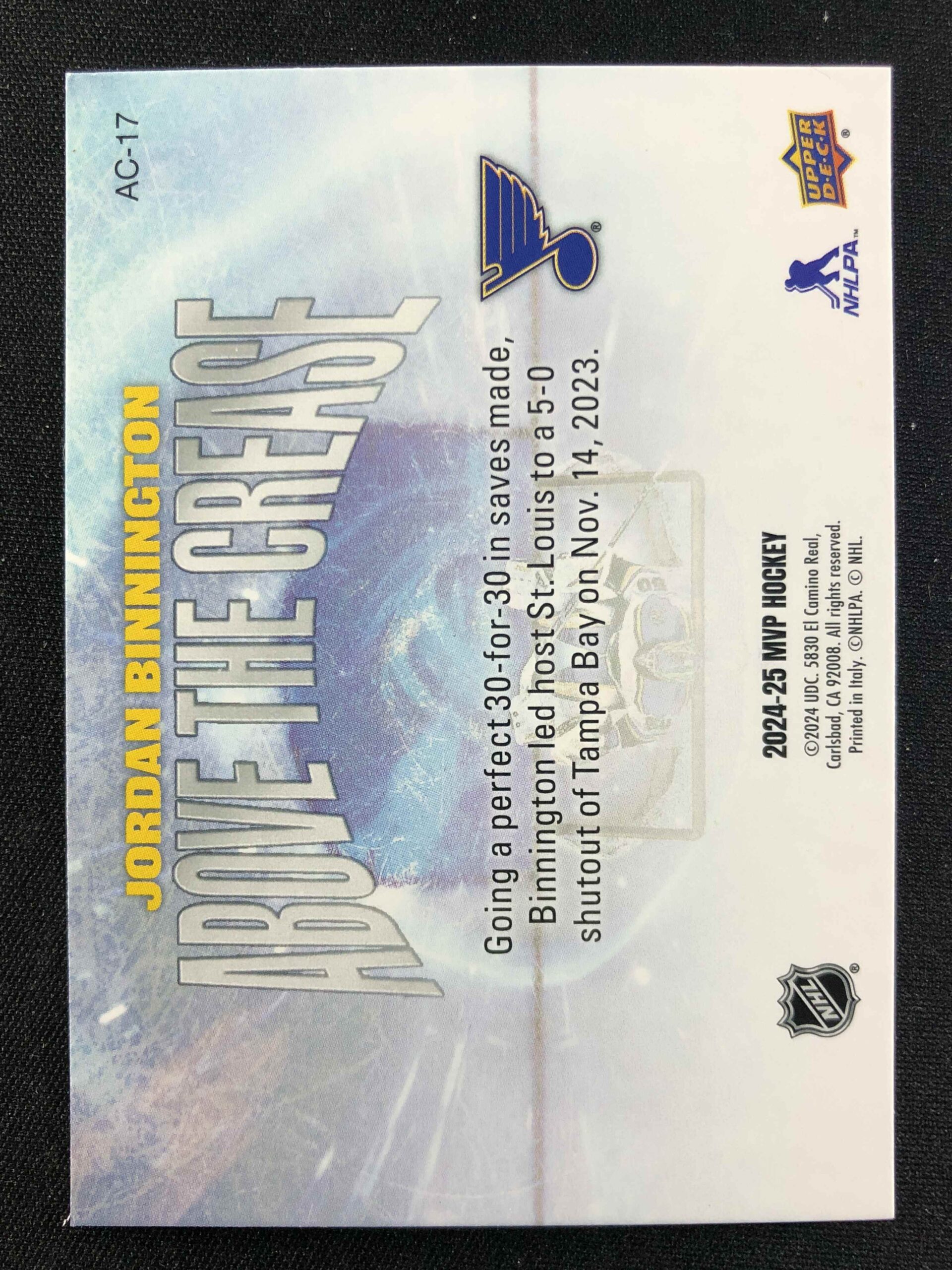 Sběratelská karta 2024/2025 Upper Deck MVP Above the Crease AC-17 Jordan Binnington Inzert