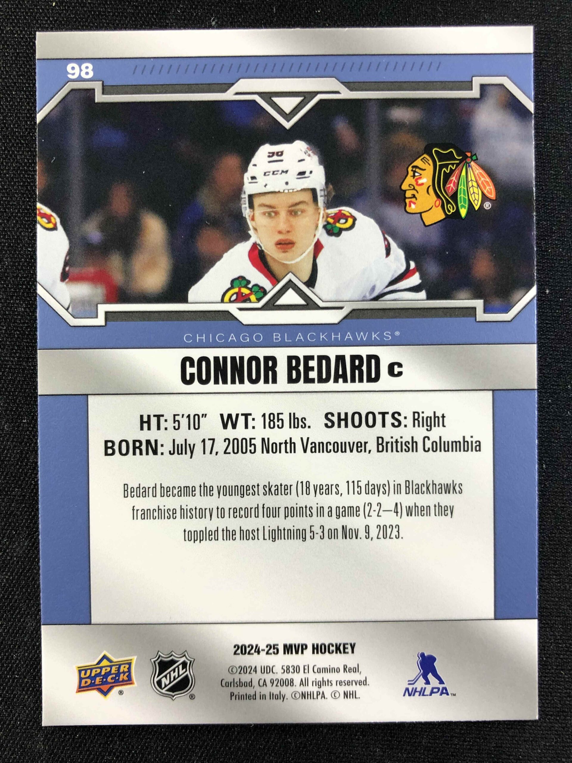 Sběratelská karta 2024/2025 Upper Deck MVP Base 98 Connor Bedard