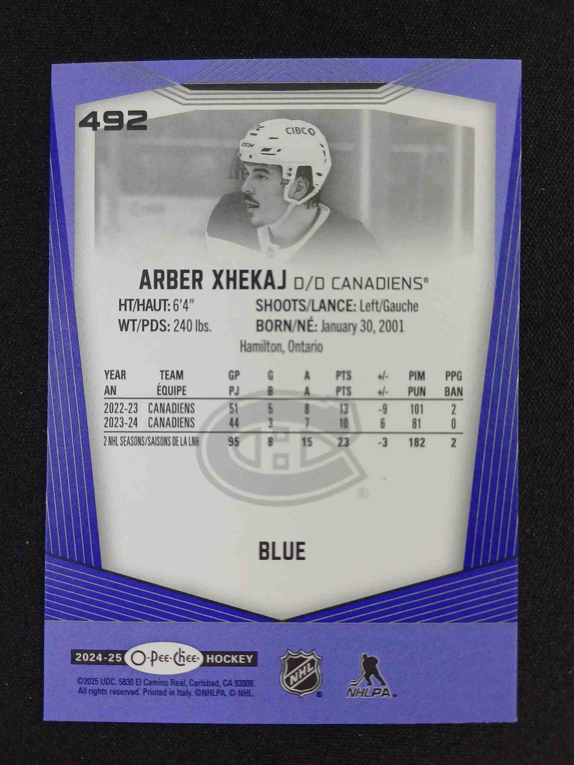 Sběratelská karta 2024/2025 Upper Deck O-Pee-Chee Blue Border 492 Arber Xhekaj Paralel