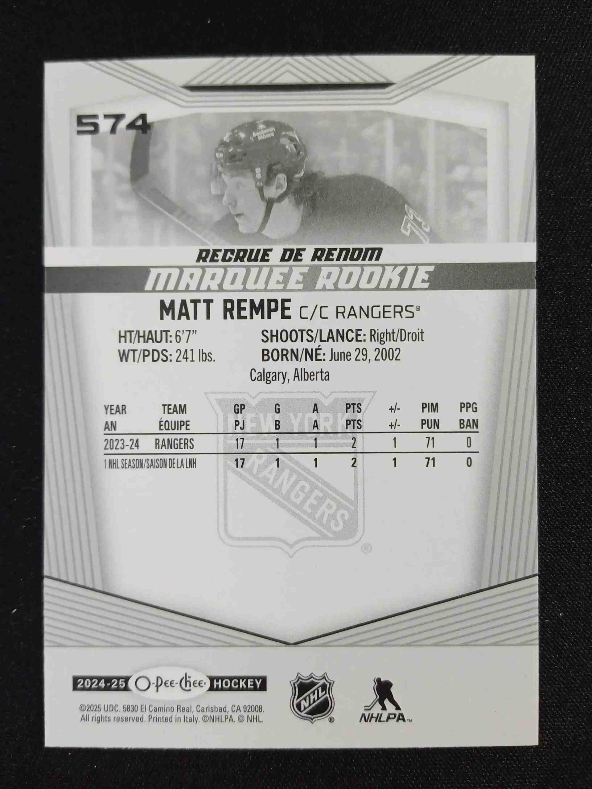 Sběratelská karta 2024/2025 Upper Deck O-Pee-Chee Marquee Rookie 567 Matt Rempe