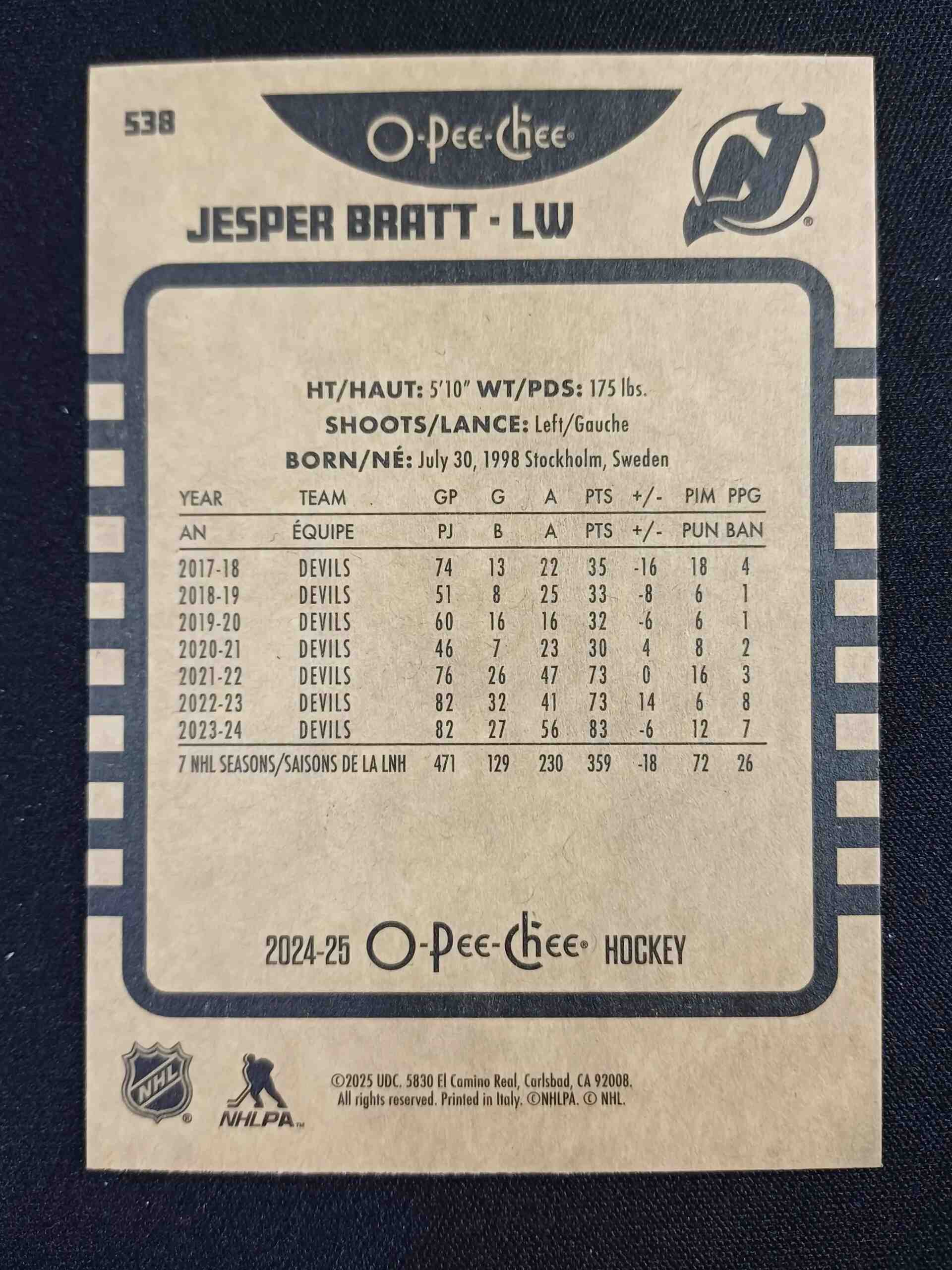 Sběratelská karta 2024/2025 Upper Deck O-Pee-Chee Retro 538 Jesper Bratt Paralel
