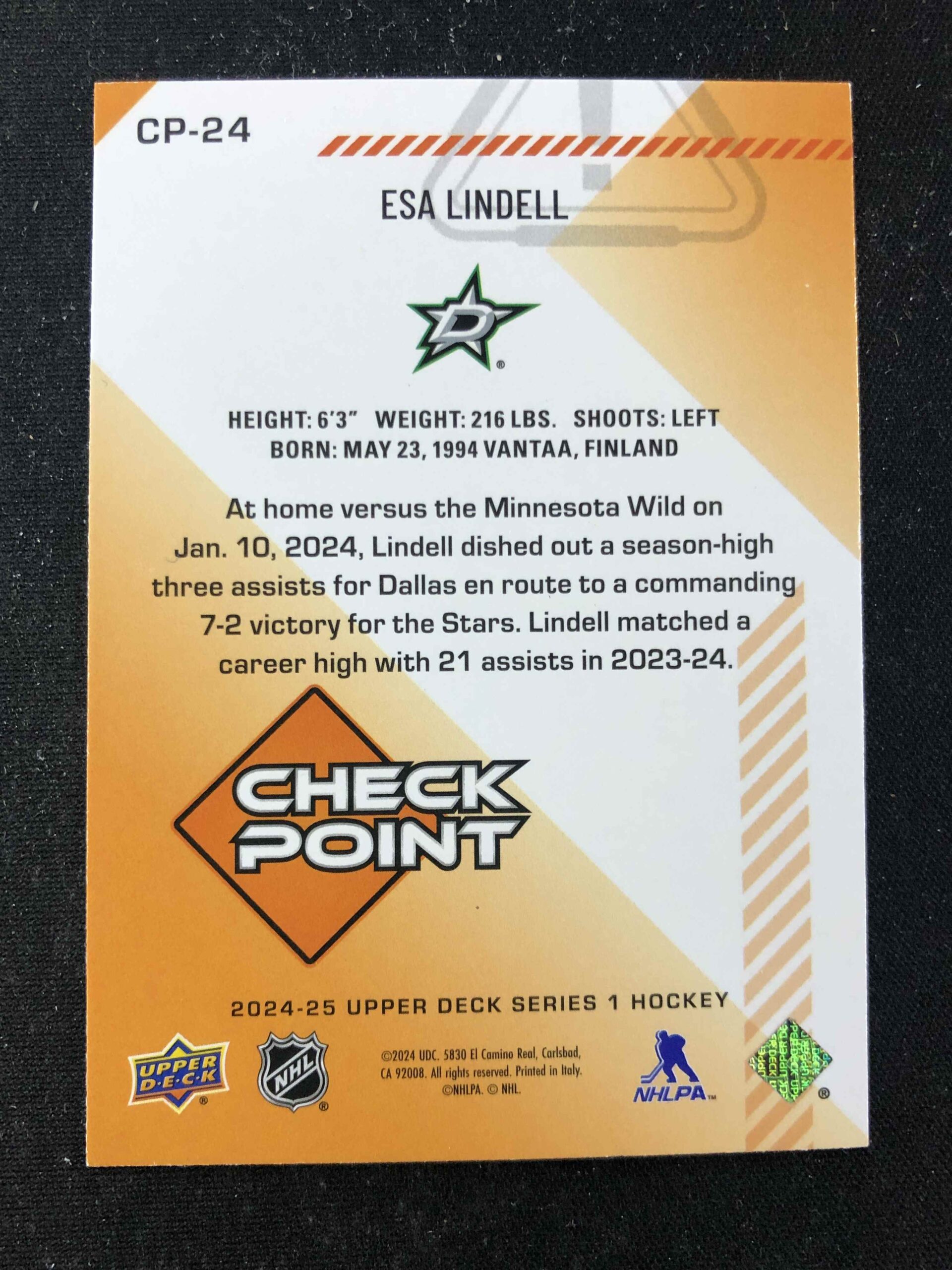Sběratelská karta 2024/2025 Upper Deck Series 1 Checkpoint CP-24 Esa Lindell Inzert