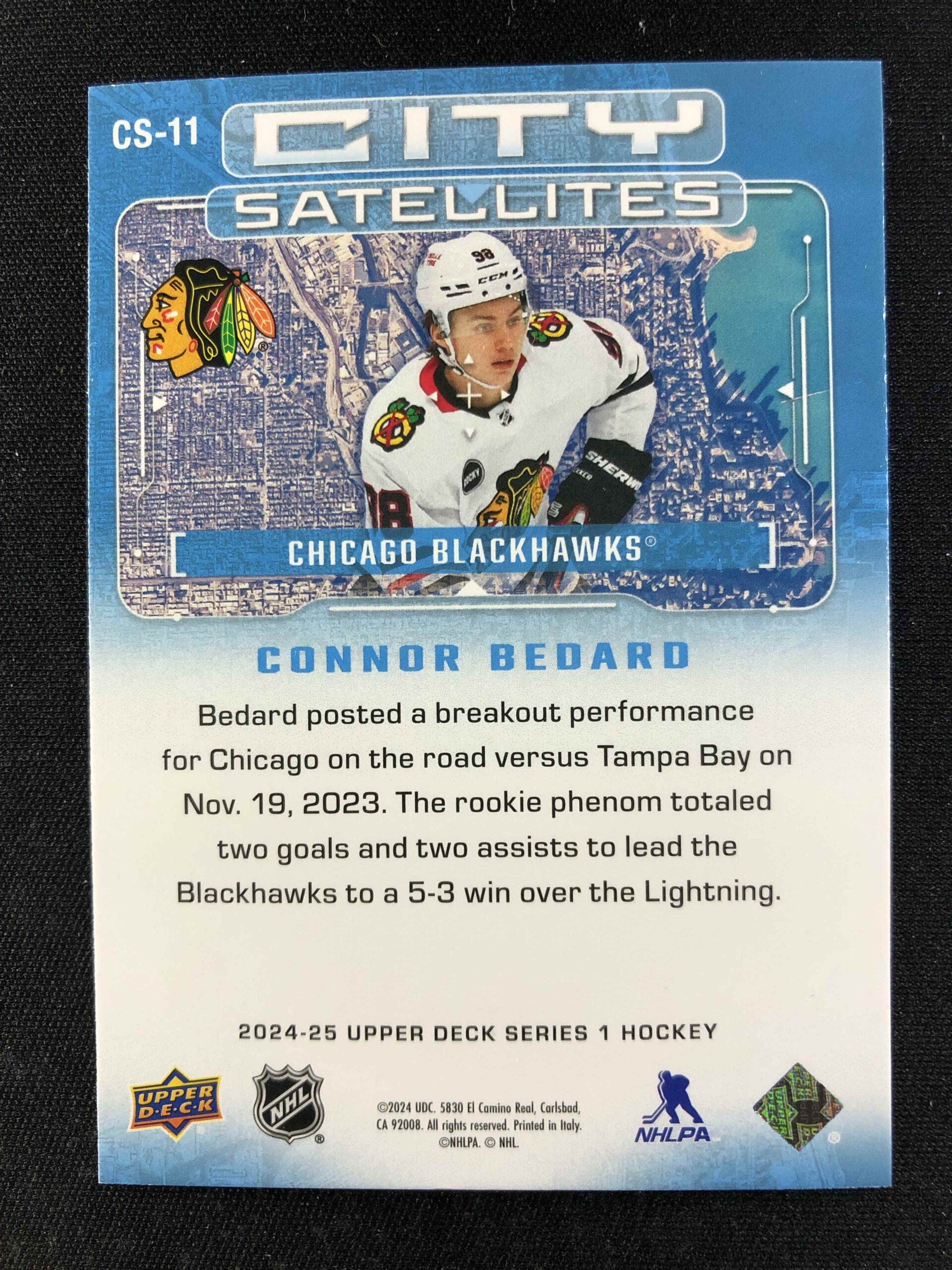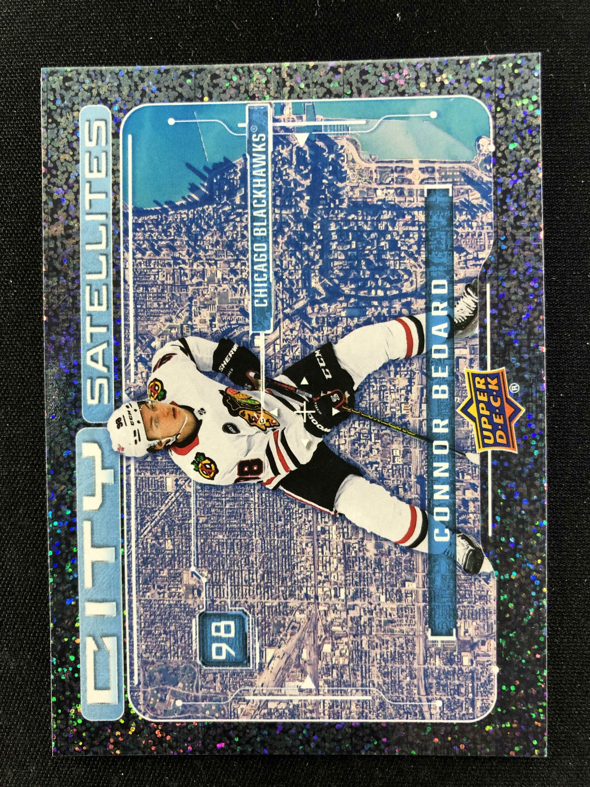 Sběratelská karta 2024/2025 Upper Deck Series 1 City Satellites Speckled CS-11 Connor Bedard Inzert