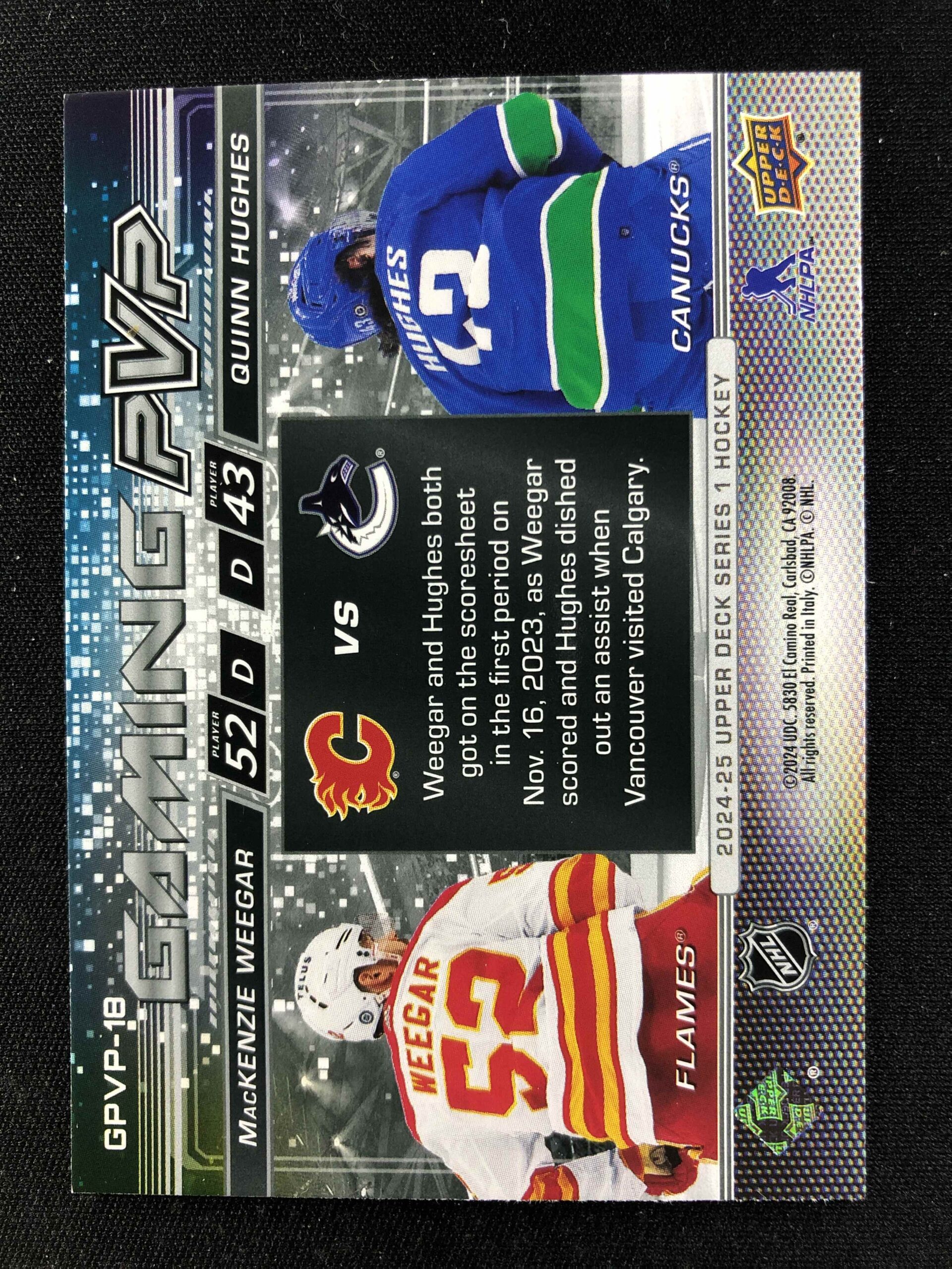 Sběratelská karta 2024/2025 Upper Deck Series 1 Gaming PVP GPVP-18 MacKenzie Weegar, Quinn Hughes Inzert