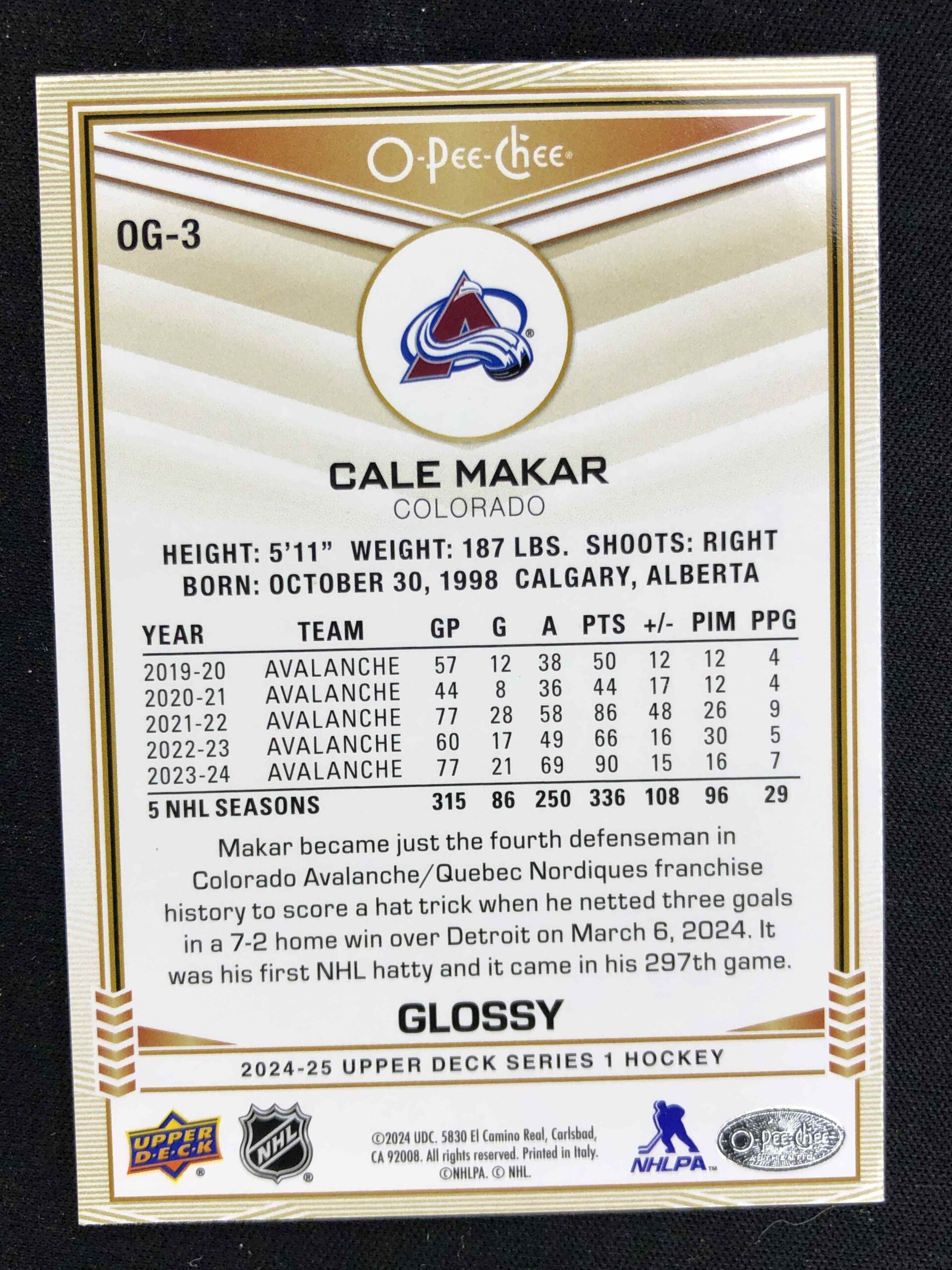 2024/2025 Upper Deck Series 1 Glossy Gold OG-3 Cale Makar Inzert