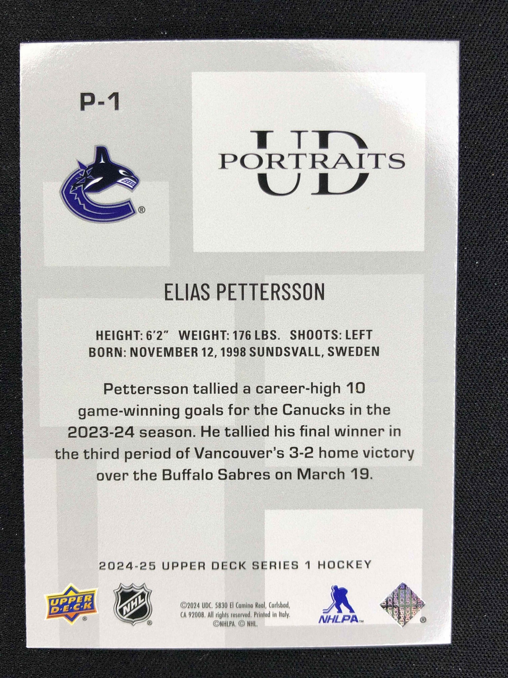 Sběratelská karta 2024/2025 Upper Deck Series 1 Portraits P-1 Elias Pettersson Inzert