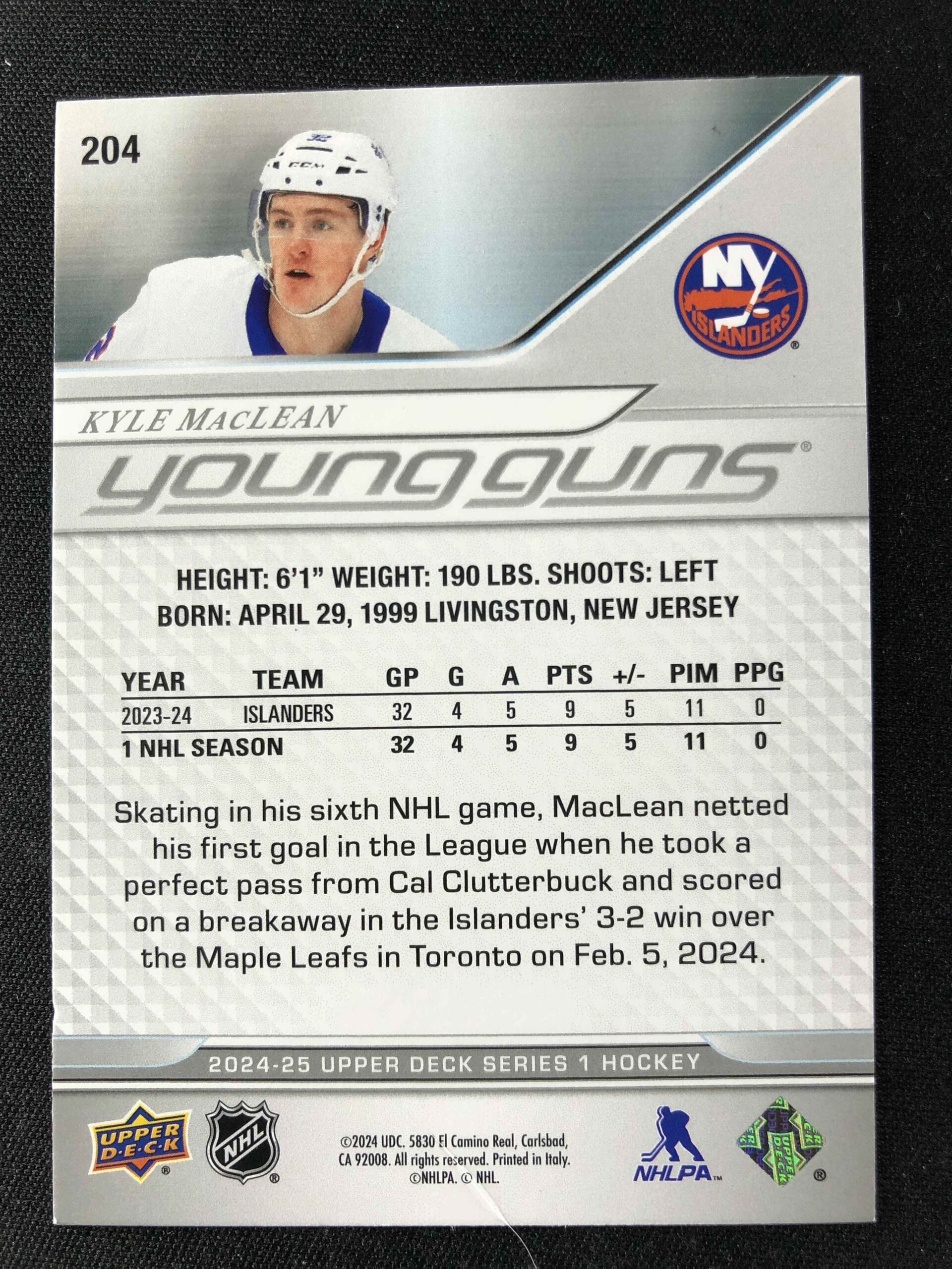 Sběratelská karta 2024/2025 Upper Deck Series 1 Young Guns 204 Kyle MacLean Inzert