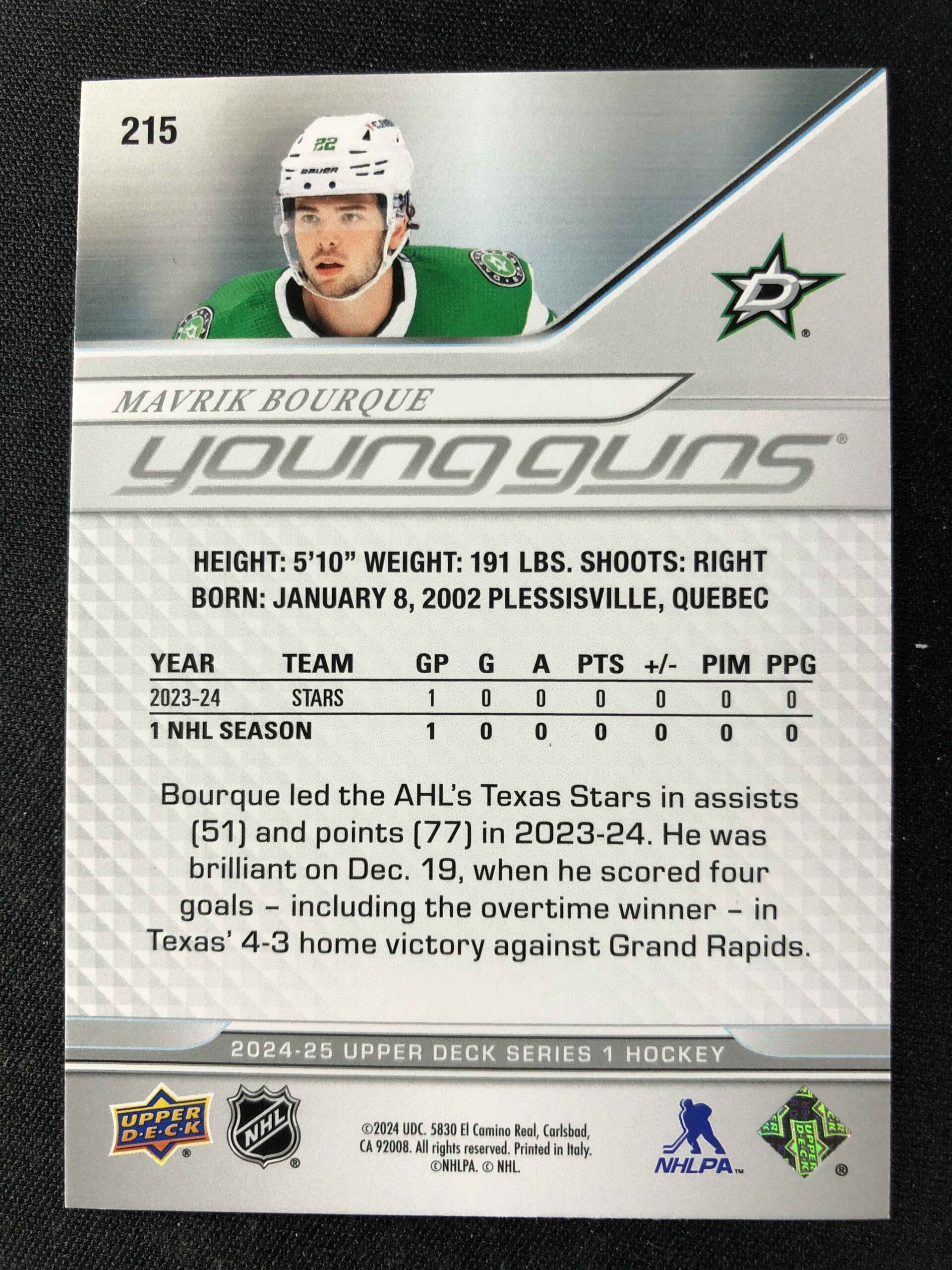 Sběratelská karta 2024/2025 Upper Deck Series 1 Young Guns 215 Mavrik Bourque Inzert