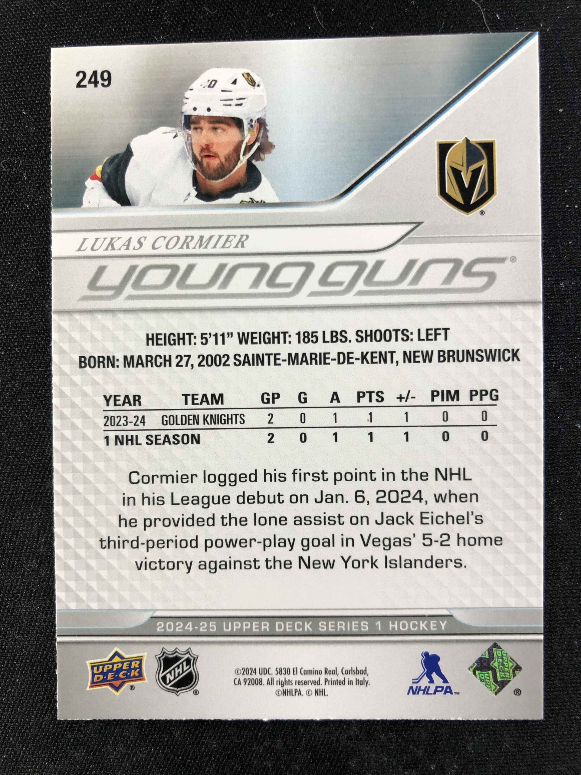 Sběratelská karta 2024/2025 Upper Deck Series 1 Young Guns 249 Lukas Cormier Inzert