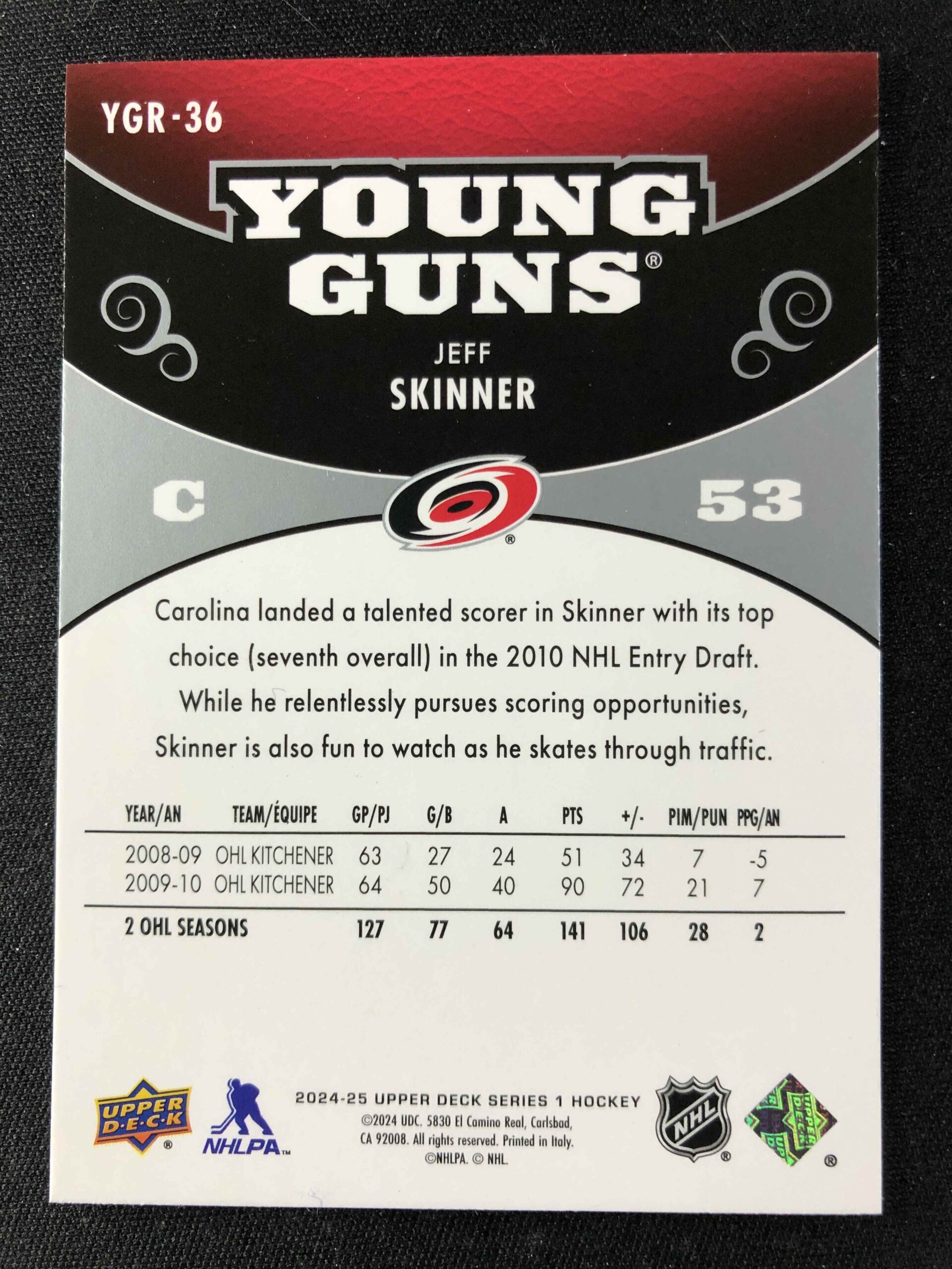 Sběratelská karta 2024/2025 Upper Deck Series 1 Young Guns Renewed YGR-36 Jeff Skinner Inzert