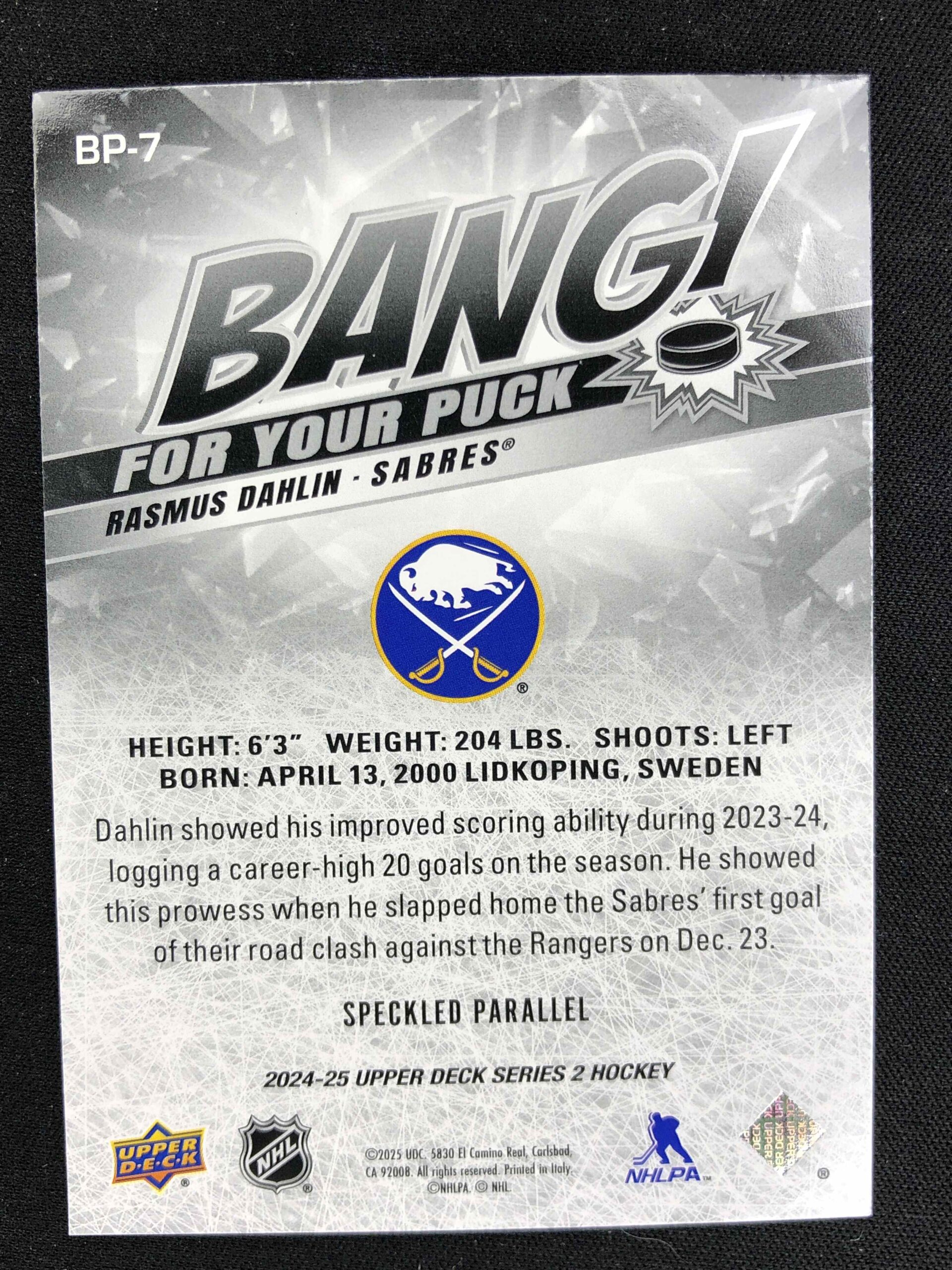 Sběratelská karta 2024/2025 Upper Deck Series 2 Bang! For Your Puck Speckled BP-7 Rasmus Dahlin Inzert