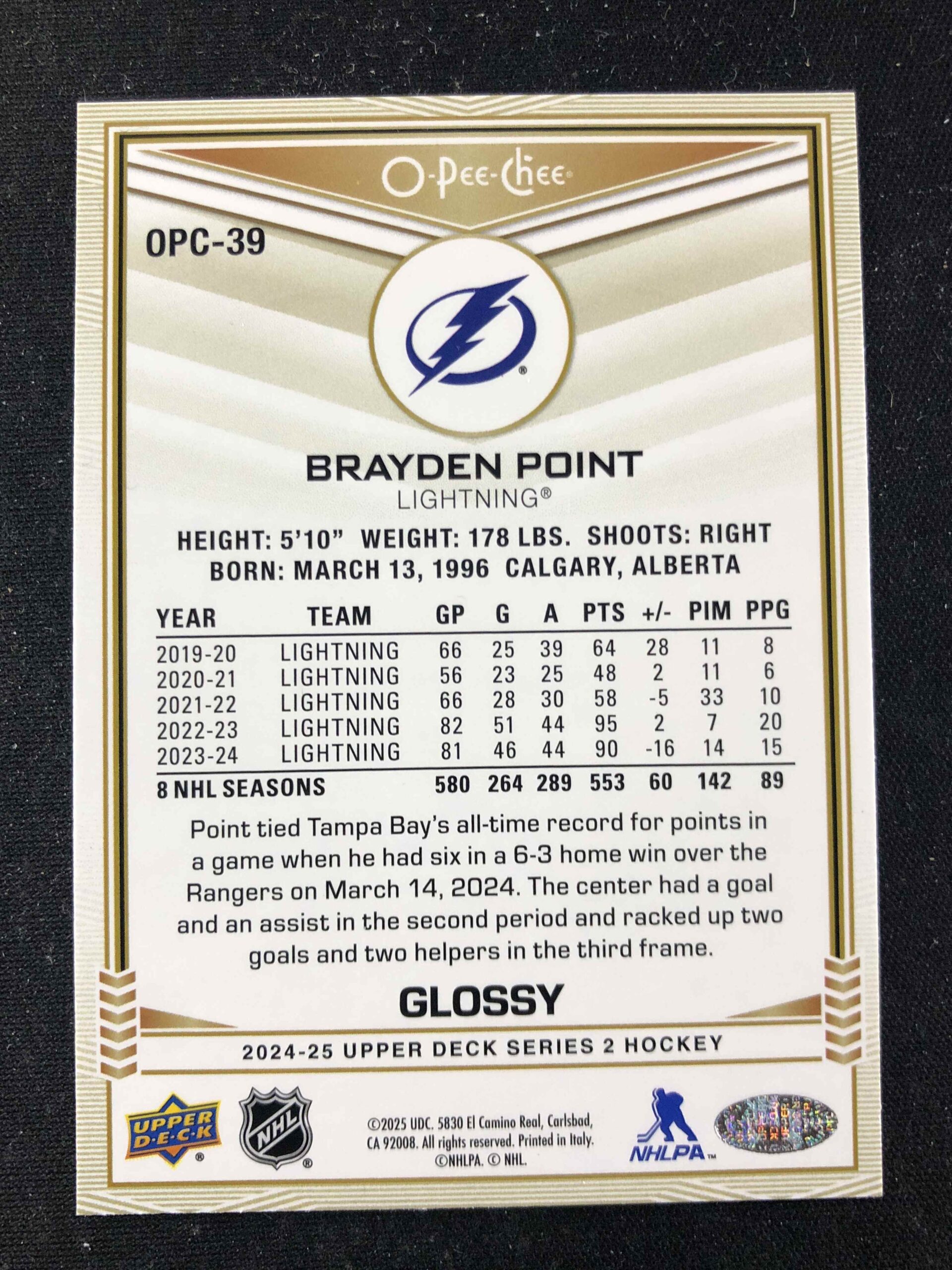 Sběratelská karta 2024/2025 Upper Deck Series 2 Glossy Gold OPC-39 Brayden Point Inzert