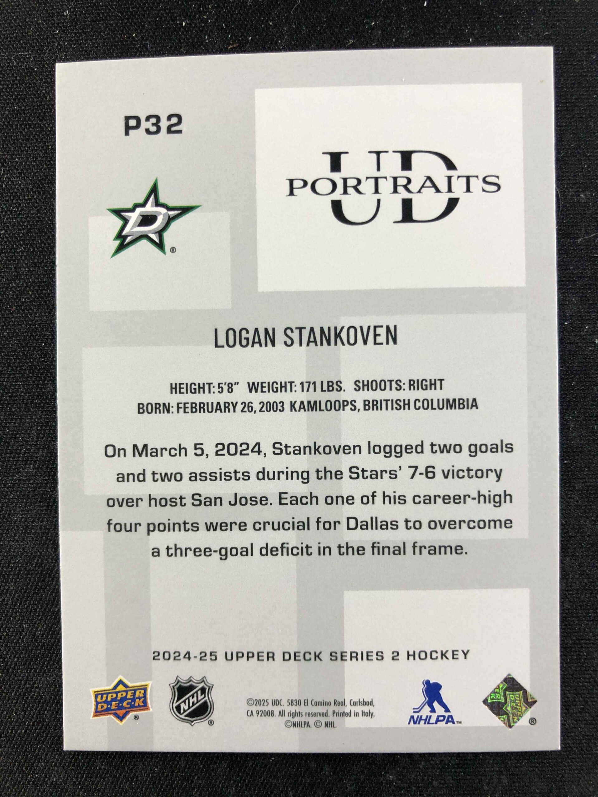 Sběratelská karta 2024/2025 Upper Deck Series 2 Portraits P32 Logan Stankoven Inzert