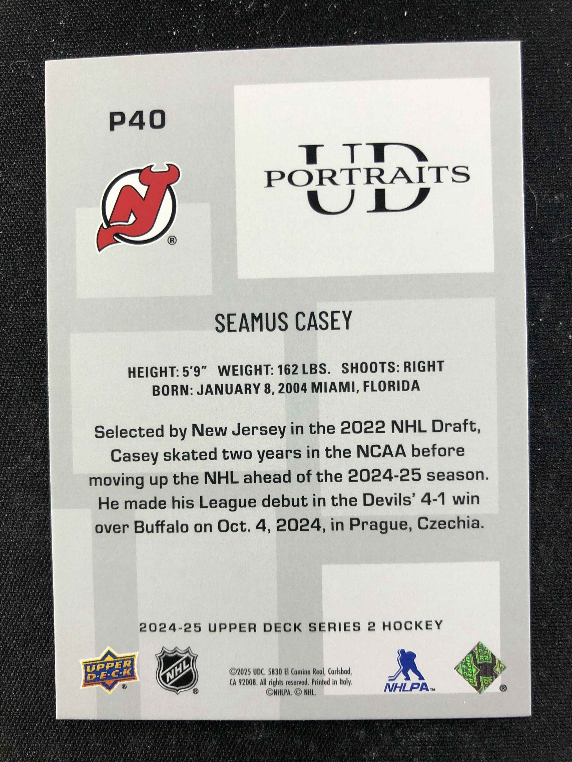 Sběratelská karta 2024/2025 Upper Deck Series 2 Portraits P40 Seamus Casey Inzert