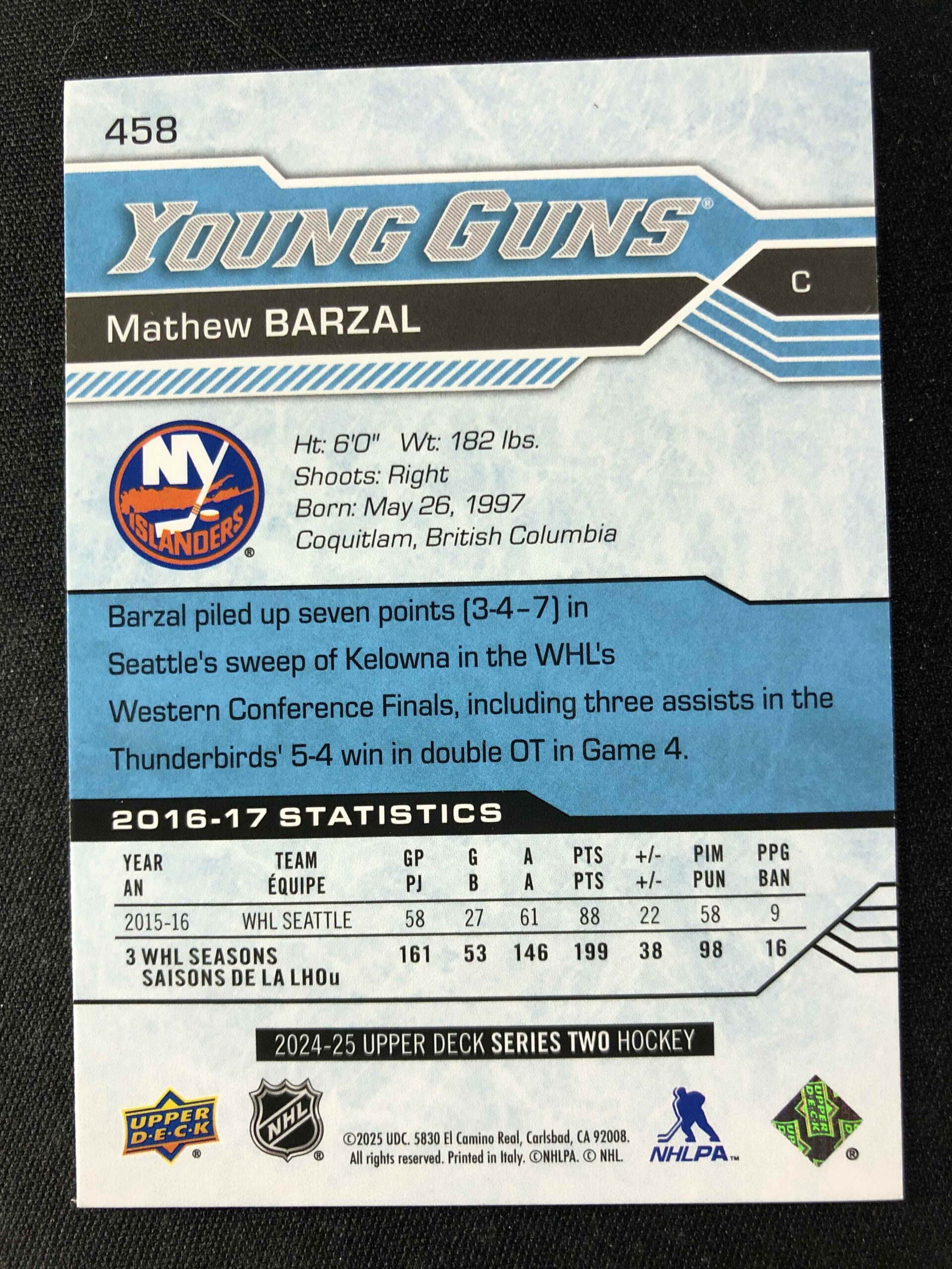 Sběratelská karta 2024/2025 Upper Deck Series 2 Young Guns Renewed 458 Mathew Barzal Inzert