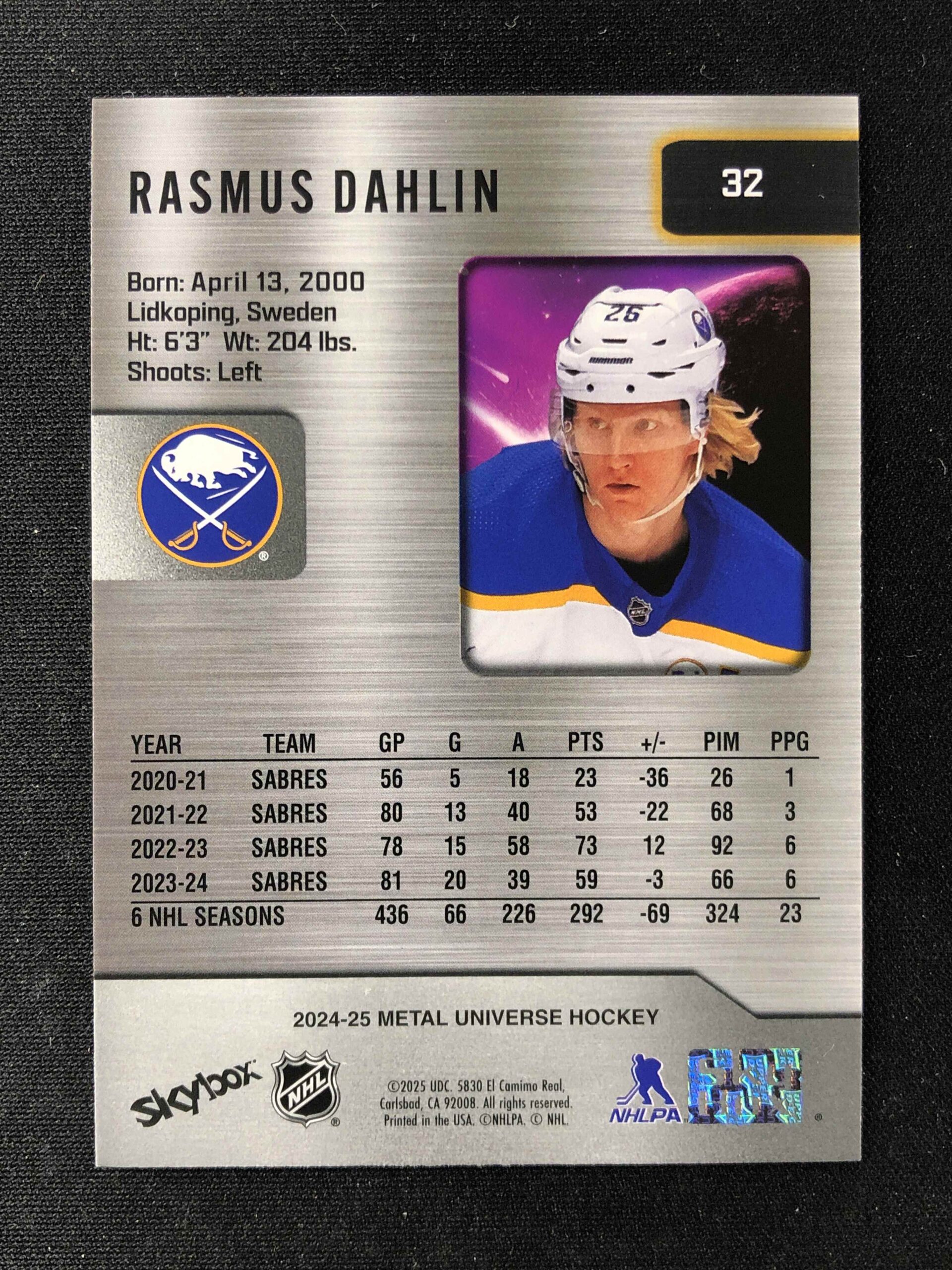 Sběratelská karta 2024/2025 Upper Deck Skybox Metal Universe Base 32 Rasmus Dahlin