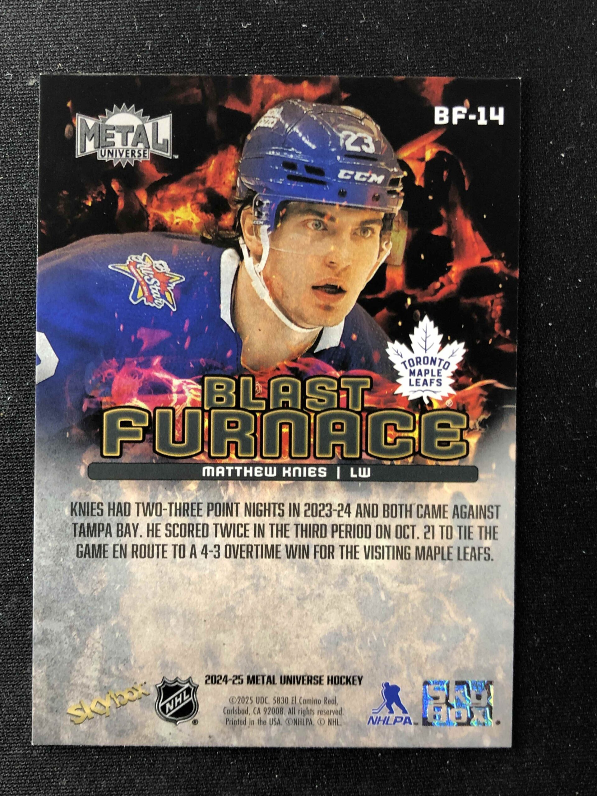 Sběratelská karta 2024/2025 Upper Deck Skybox Metal Universe Blast Furnace BF-14 Matthew Knies Inzert