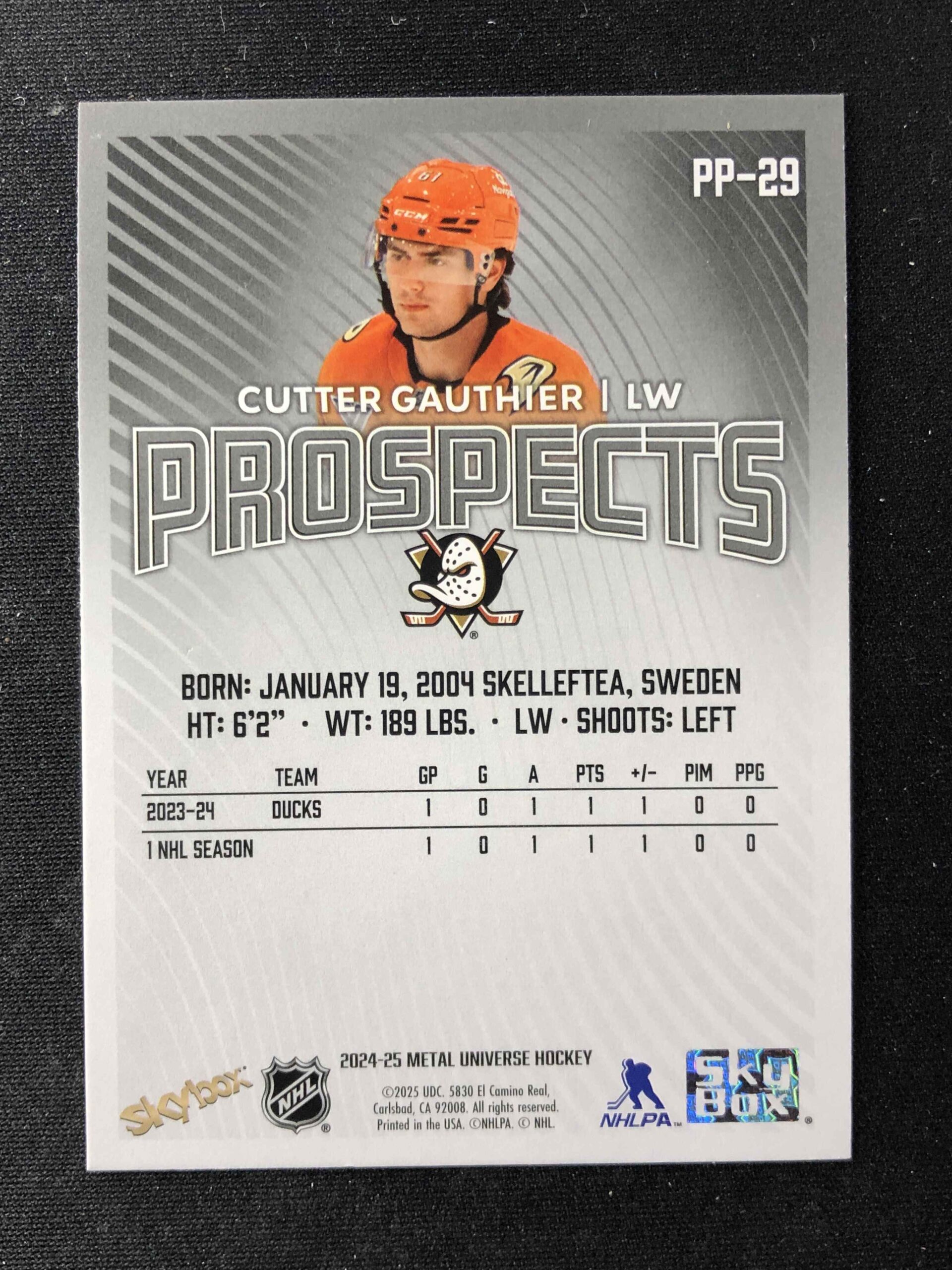 Sběratelská karta 2024/2025 Upper Deck Skybox Metal Universe Prospects PP-29 Cutter Gauthier Inzert