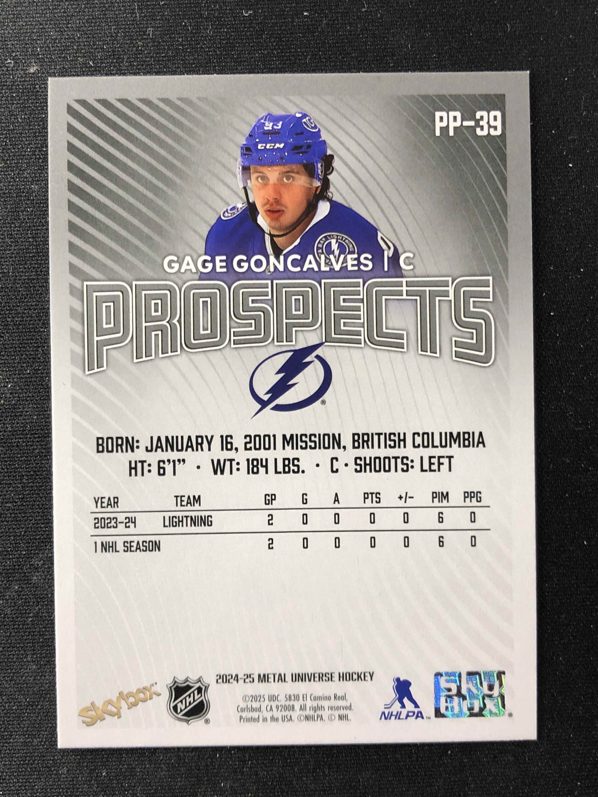 Sběratelská karta 2024/2025 Upper Deck Skybox Metal Universe Prospects PP-39 Gage Goncalves Inzert