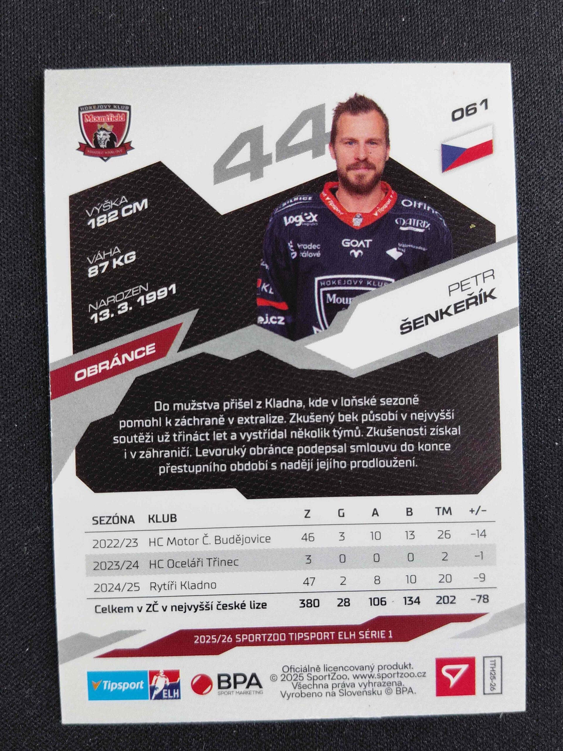 Sběratelská karta 2025/2026 Sportzoo Serie 1 Amber Gold 61 Petr Šenkeřík Paralel 09/10