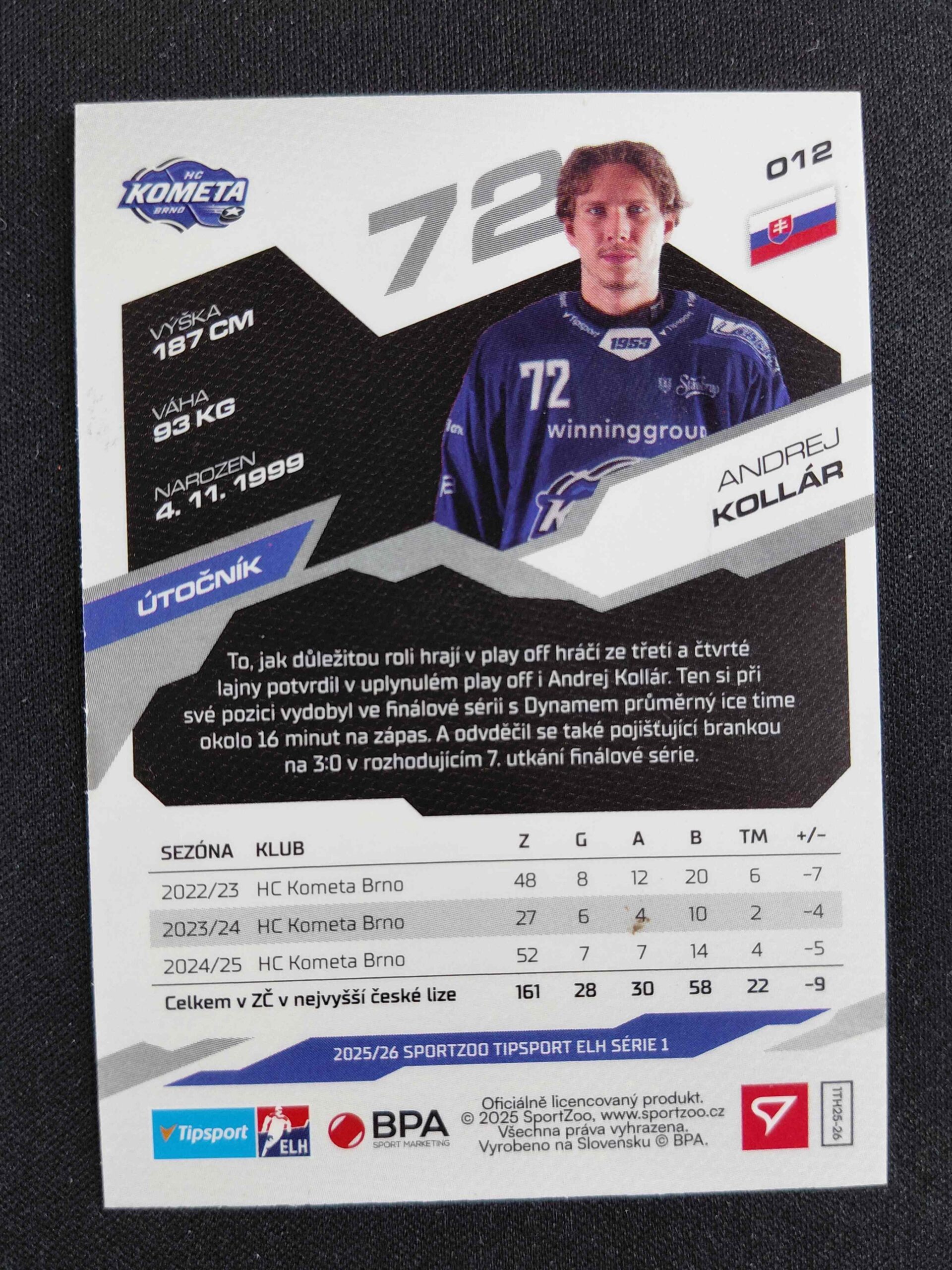 Sběratelská karta 2025/2026 Sportzoo Serie 1 Azure Blue 12 Andrej Kollár Paralel