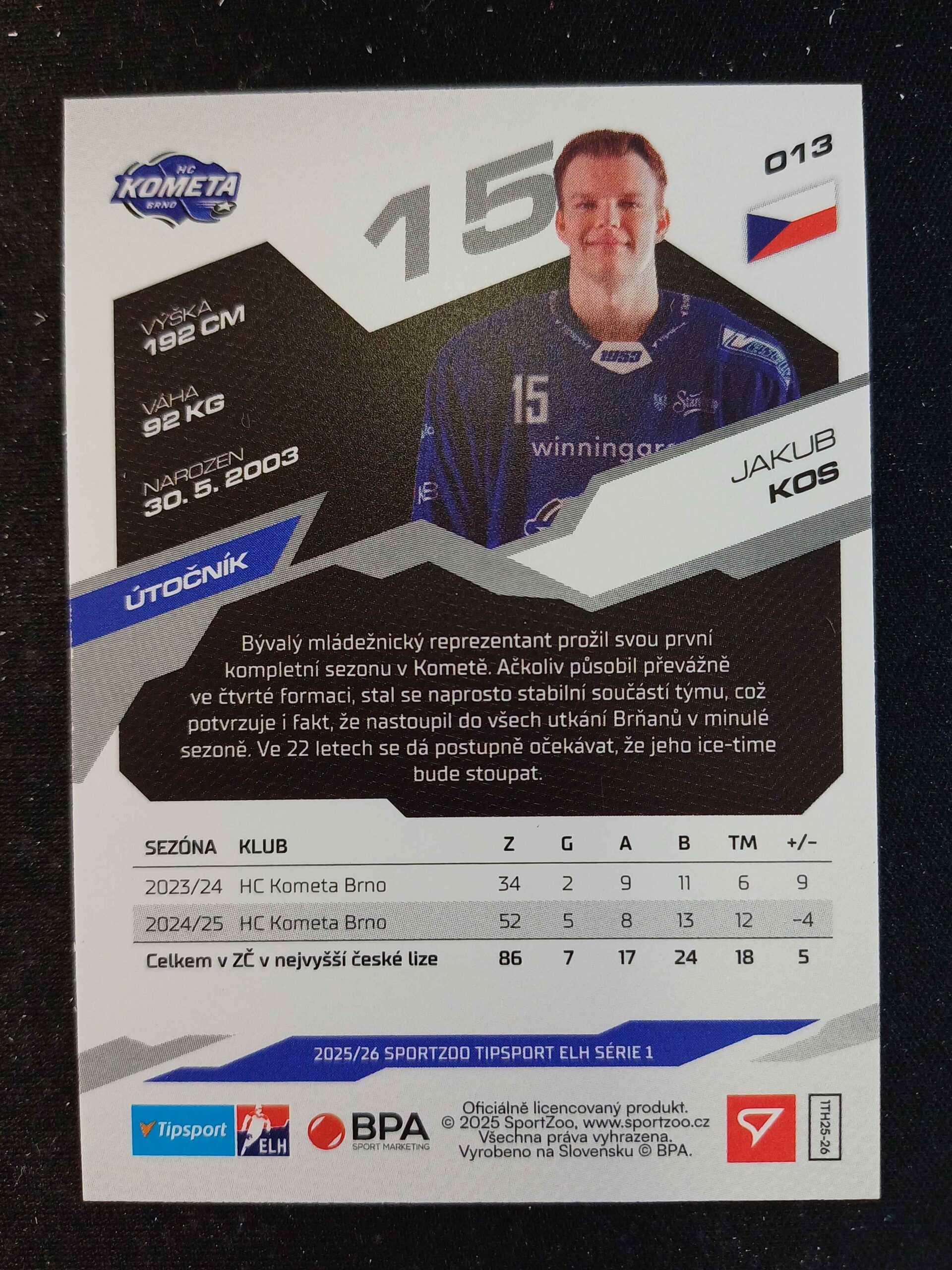 Sběratelská karta 2025/2026 Sportzoo Serie 1 Azure Blue 13 Jakub Kos Paralel