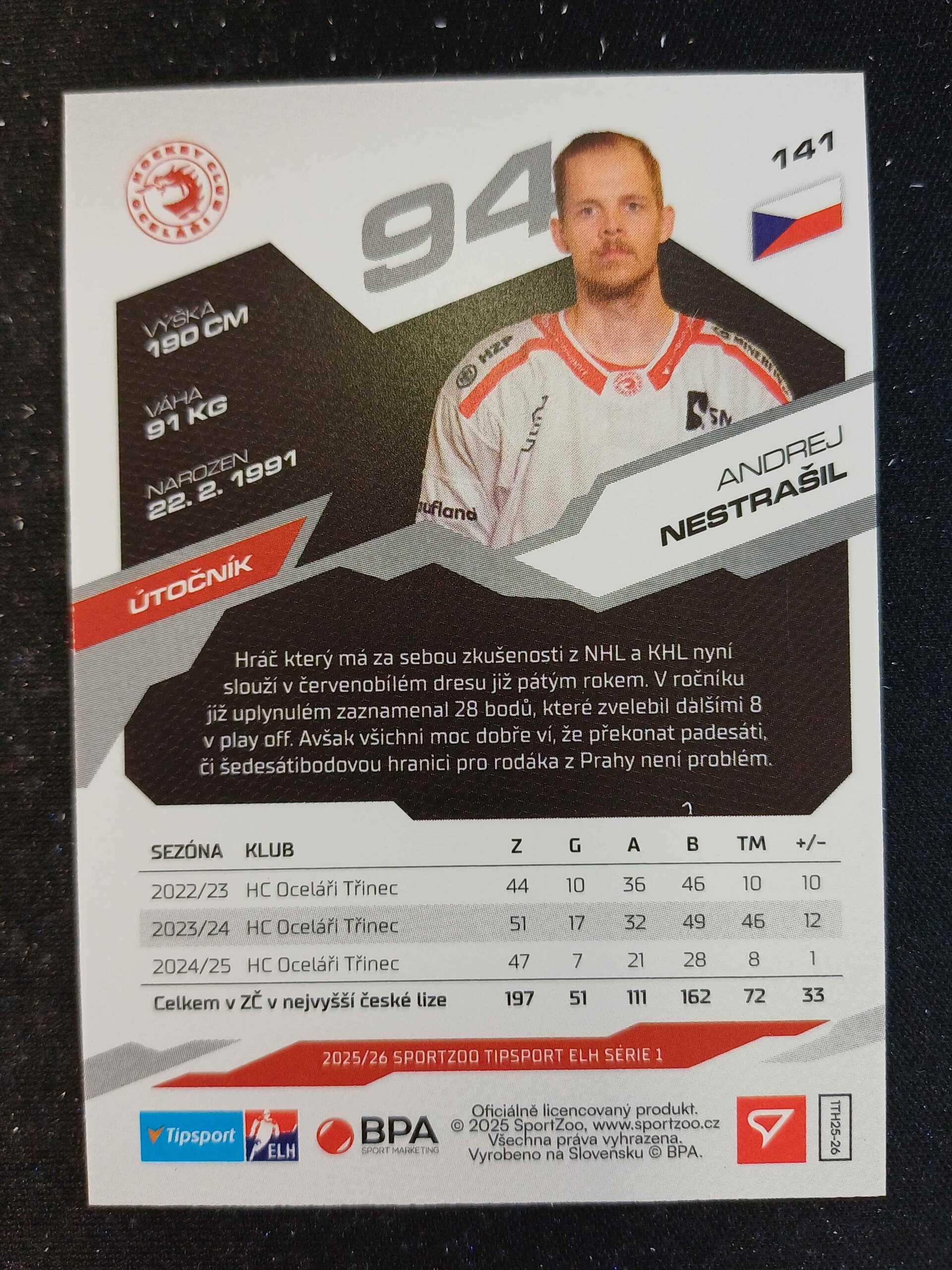 Sběratelská karta 2025/2026 Sportzoo Serie 1 Azure Blue 141 Andrej Nestrašil Paralel