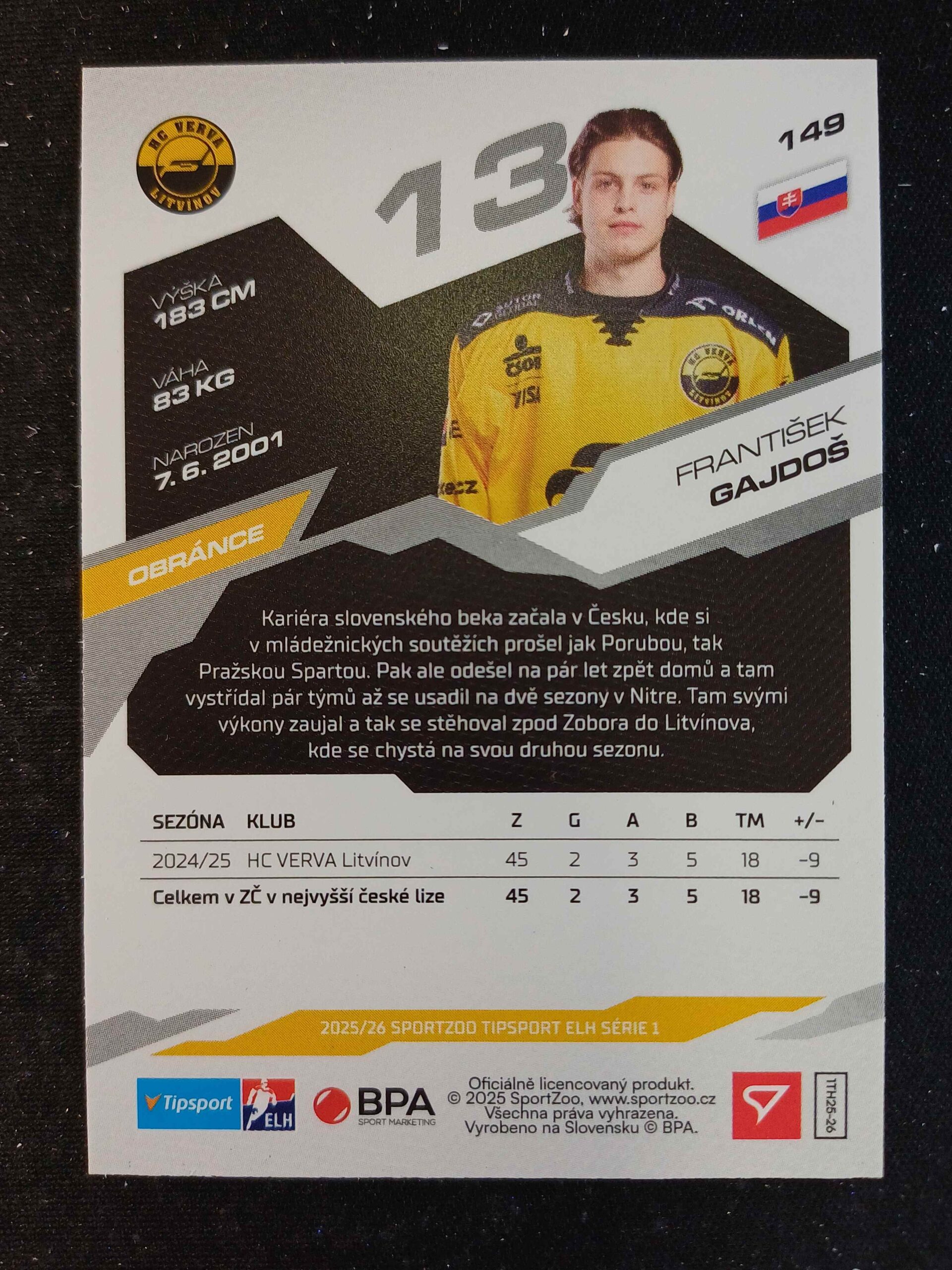 Sběratelská karta 2025/2026 Sportzoo Serie 1 Azure Blue 149 František Gajdoš Paralel