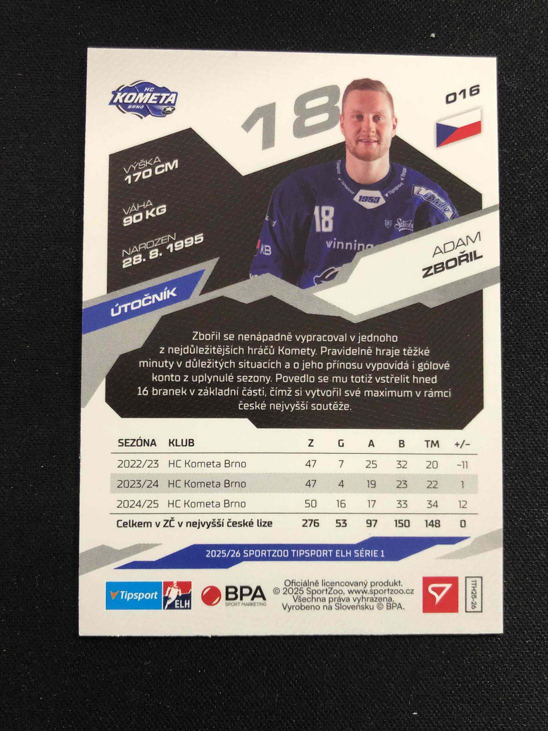 Sběratelská karta 2025/2026 Sportzoo Serie 1 Azure Blue 16 Adam Zbořil Paralel