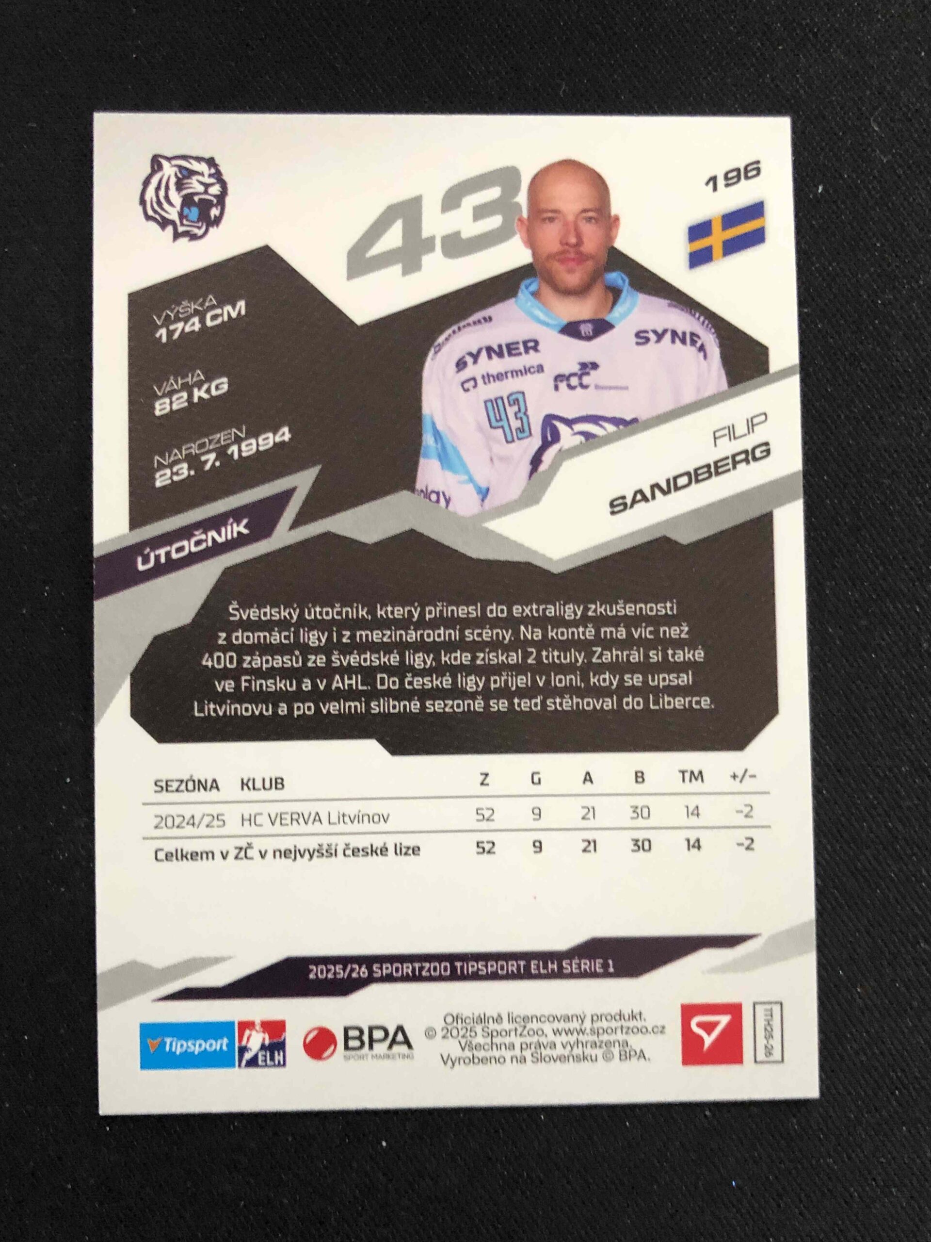 Sběratelská karta 2025/2026 Sportzoo Serie 1 Azure Blue 196 Filip Sandberg Paralel